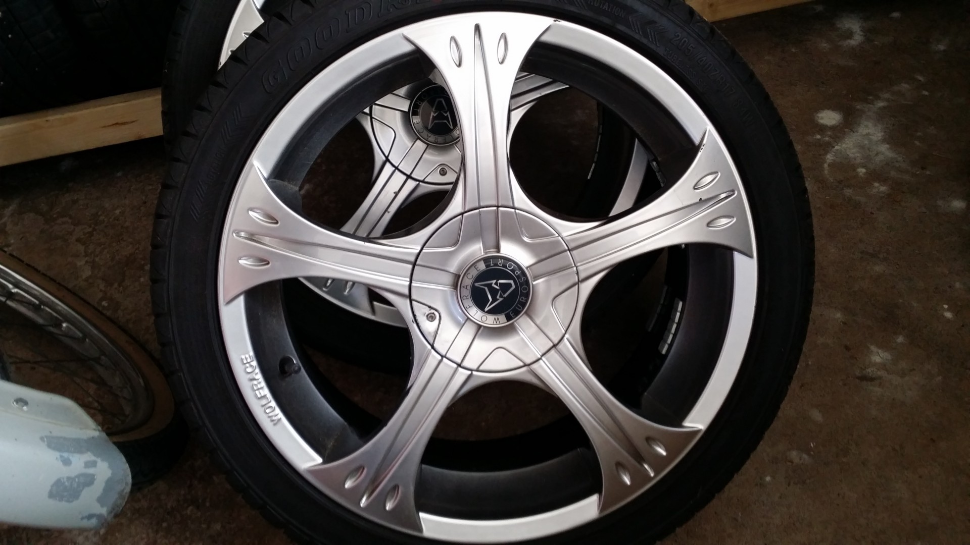 4 beg Wolfrace med 205/40×17 däck där 2 är fina och 2 kantslitna (pga fel hjulvinkel på bilen dom satt på innan min Saab).
