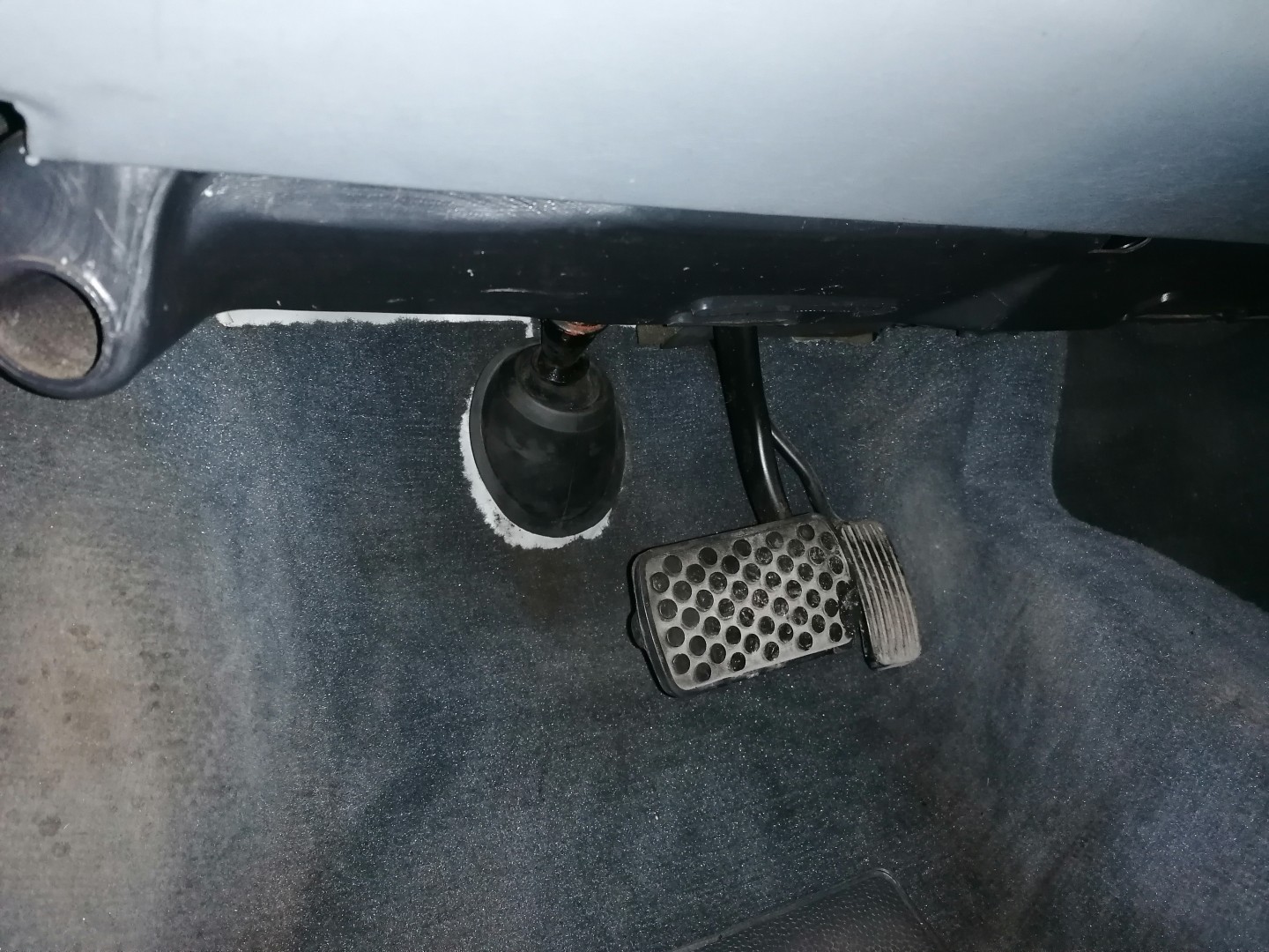 När jag dammsög fick jag se att gummismocken till rattstången hängde löst. Dessutom saknas plastringen som ska hålla mattan. Nu råkar jag veta att servostyrningen är eftermonterad…