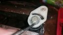 I verkstadshandboknen står det att man ska dra loss klipset som håller låset neråt. Detta tycker jag är krångligt och risken att man slinter är stor. Därför gör jag det i två steg. Trä in en stor mejsel emellan låset och klipset, vrid åt båda håll så lirkar sig klipset neråt men när mejseln ”roterar” trär man in tex en större stjärnmejsel som mellanlägg att bända emot och vips så är låset löst.