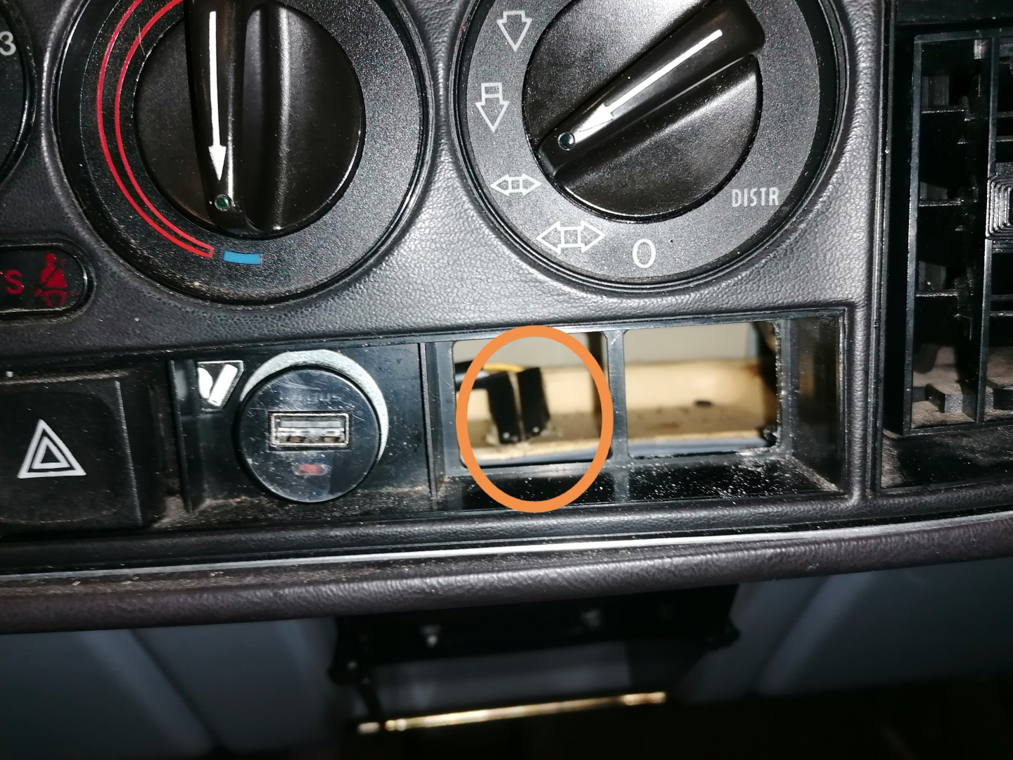 Där under sitter dessa två skruvar.Därefter lyfter man upp toppen på konsolen, kopplar ur strömbrytaren, likar ut locket genom toppen eller då damasken. Man får justera handbromsspaken efter behov.