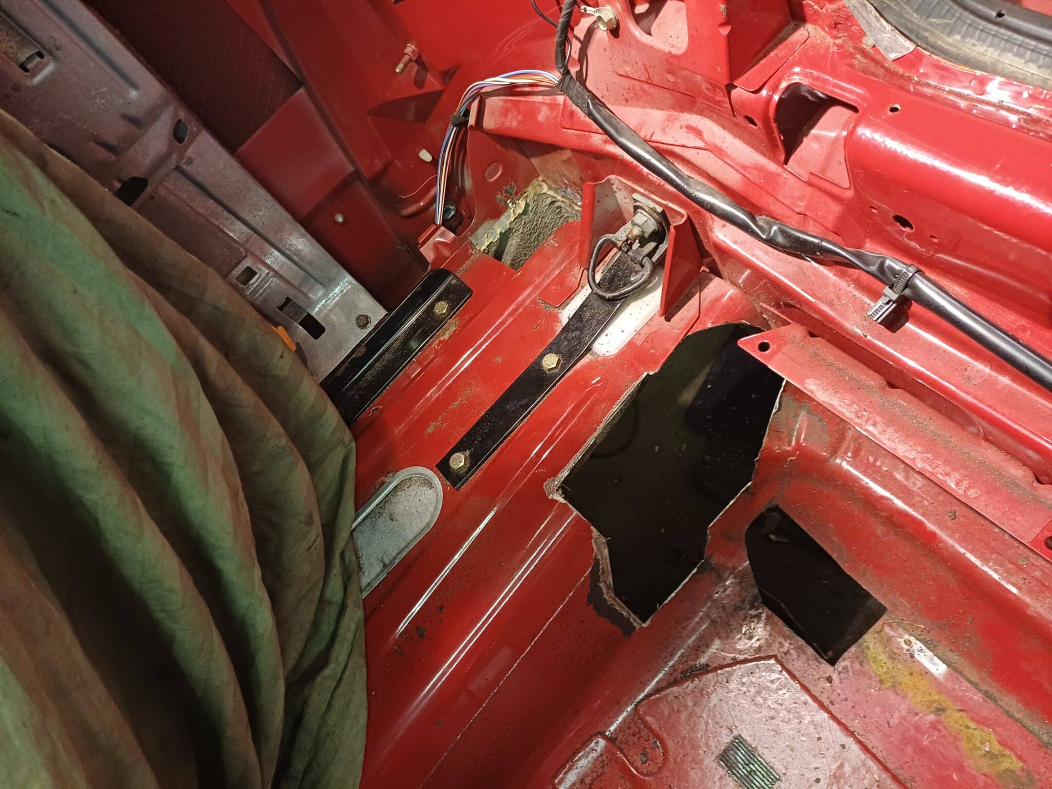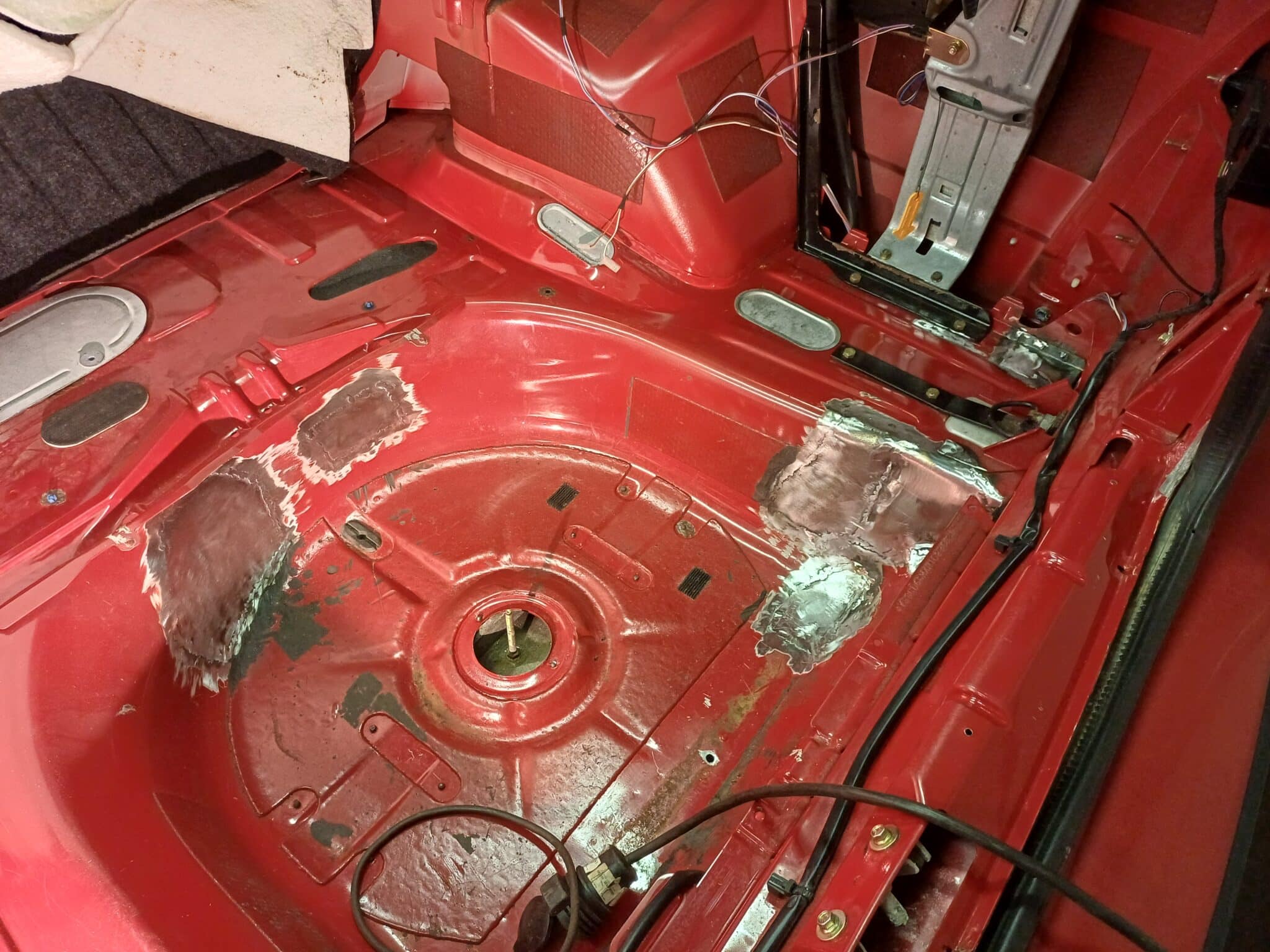 Lacken kan beskrivas som grårosa med vaxrester högt och lågt (så någon har försökt iallafall). Det svarta lädret var mer åt mörkbrunt, mattorna och dörrtextilierna fulla med hundhår. Aghrrr, förarstolen har nötts sönder av snickarens verktyg… Innertaket var intakt och mäteran säger 19000 mil vilket ger lite positivitet. Vid krypande inspiration konstateras att rostskador finns i reservhjulsbaljan och att främre domkraftsfästen är söndrelyfta. Fästörat för remspännarbulten konstateras oxå vara lite skadat.