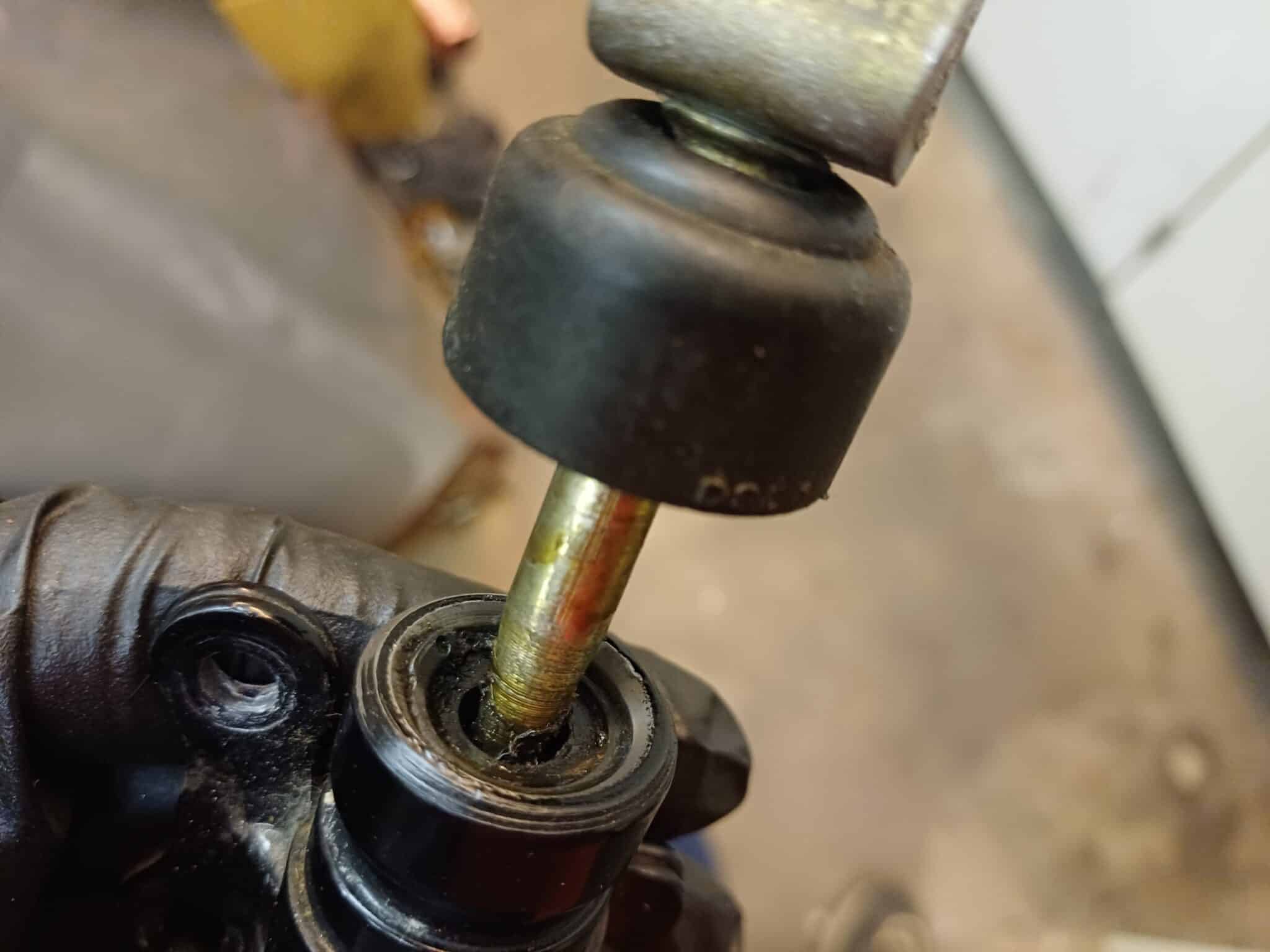 Kopplingspedalen behöver hjälp upp. Hjälpet inte att dra igenom nu vätska. Efter att repsats beställts så monterades huvudcylindern ner. Då upptäckte jag att gummigenomförningen till röret hängde löst. Knöka å knåda så vart det dit med det. Såg även att pedalkontakten till farthållaren inte nådde mer än nästan till pedalen. Att få isär cylindern började såhär…