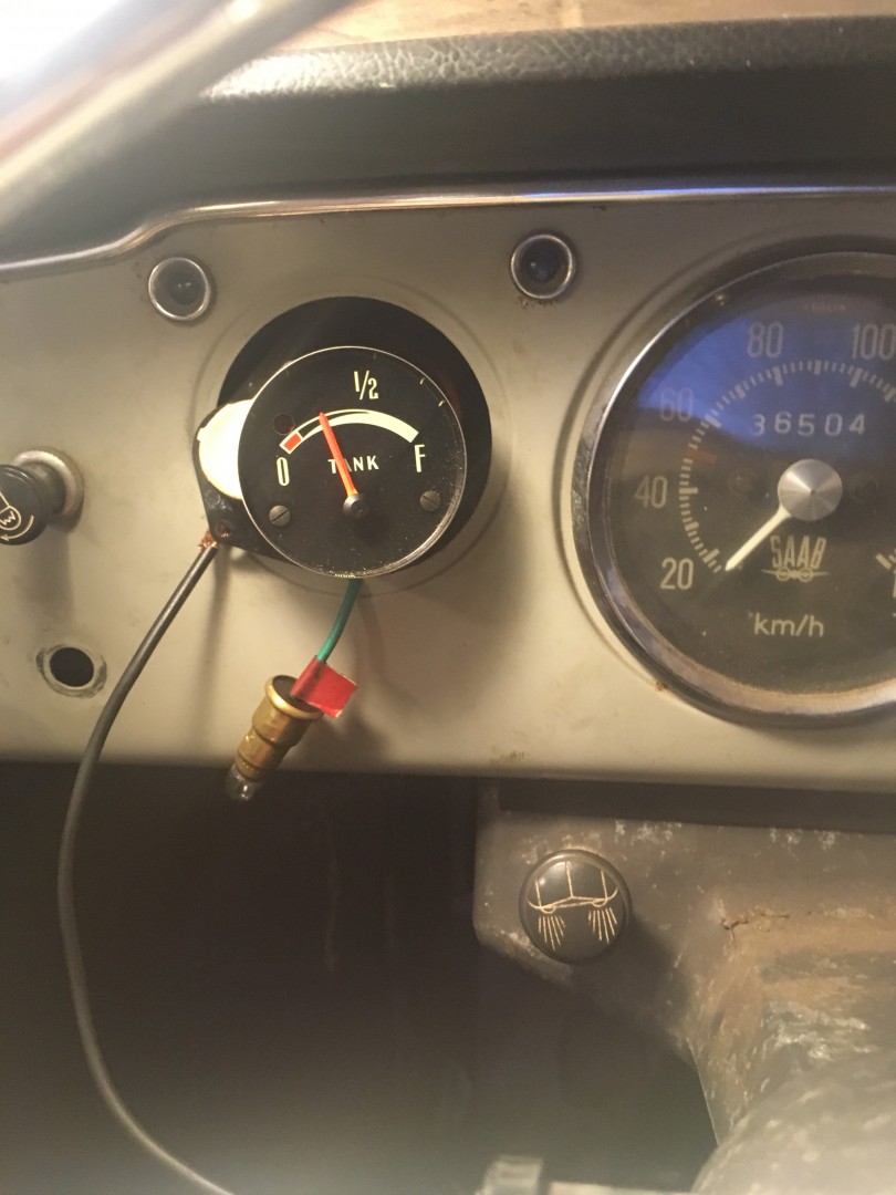 Hade ett liknande problem på min V4. Med cirka 10L i tanken slog mätaren upp och ner och lampan var tänd. Bytte plats på kablarna och lampan slocknade och mätaren stod på 1/3. ? Problemet var bara att när jag slog av tändningen stod mätaren kvar på 1/3.? Så nu vet jag varken ut eller in…?