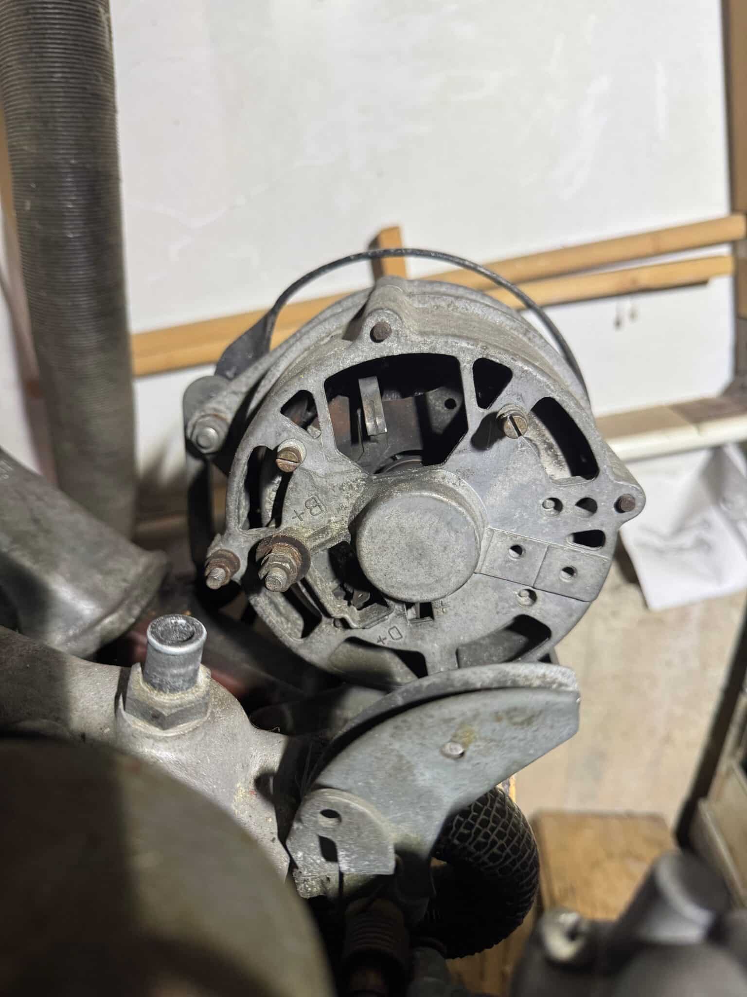 Vy bakifrån 35 A generator med borttagen borstbrygga-kontakt2) förmodad 55 A Bosch generator som saknade borstbrygga-kontakt alt. laddregulator (som jag önskar använda på EMS motorn. Har rätt 99-fäste)
