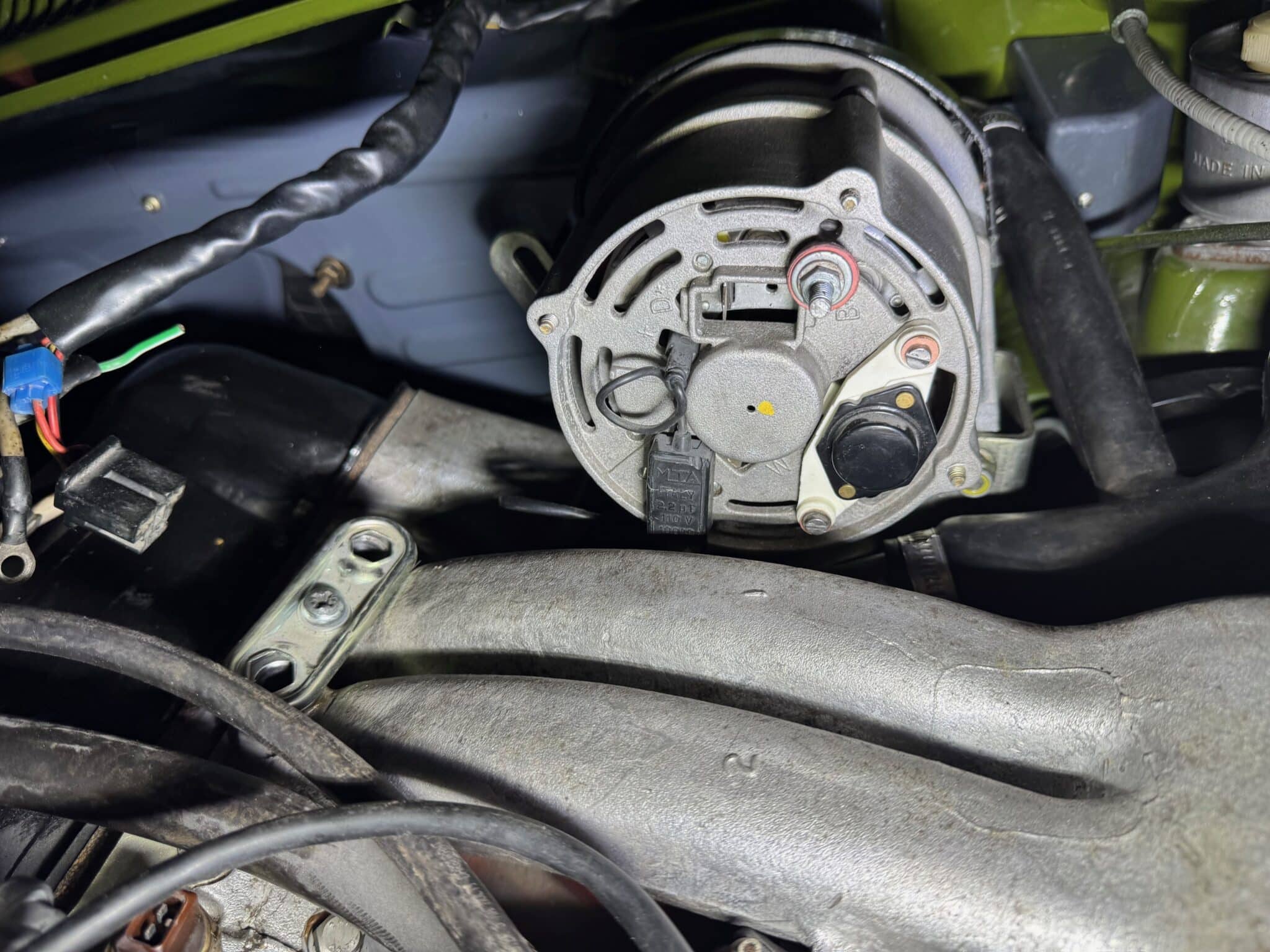 Bilden visar frontvy med 3-pol kontakt på laddningsregulatorn på orginal B201 B-typ 95 hk motor med Bosch 35 A generator.