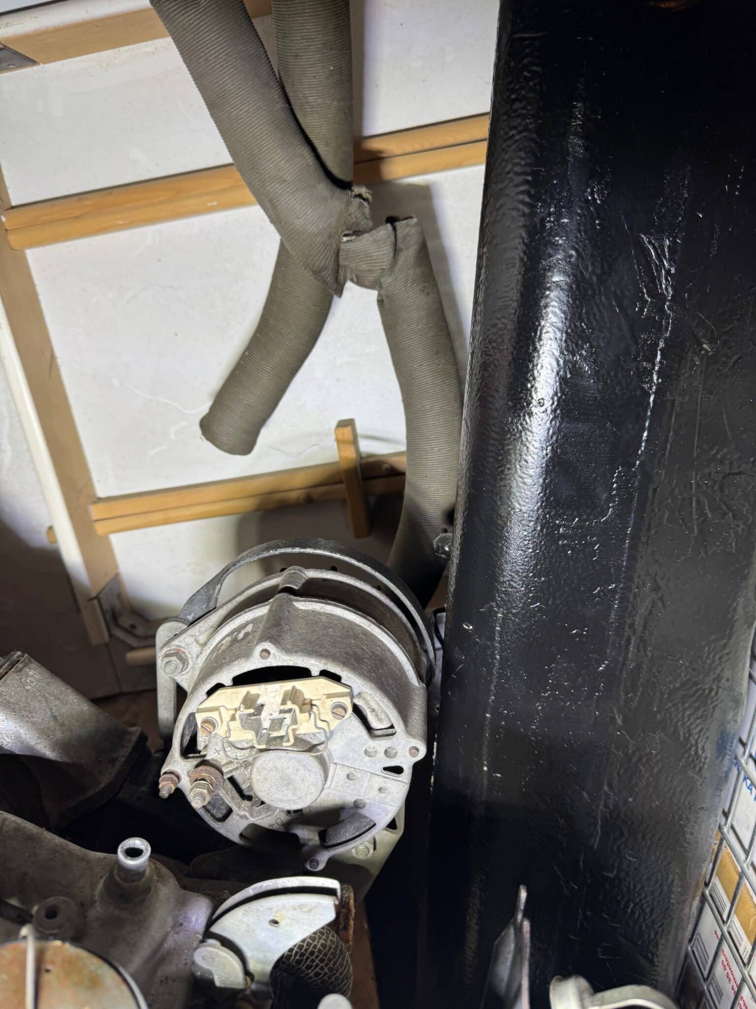 Bilden visar frontvy med aktuell generator på B201 B-typ 118 hk motor med Bosch generator. Förmodligen en 55 A. Etikett saknas. Endast separata D+ B+ anslutningar (även en W anslutning).