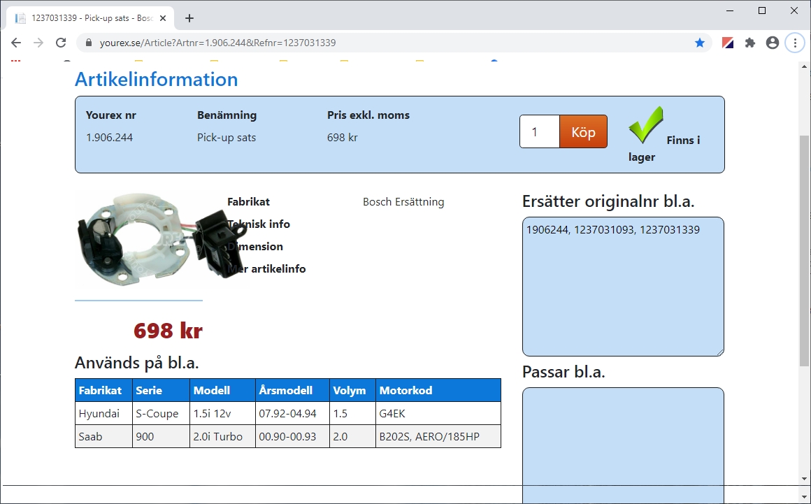 Men kanske skulle man kunna montera den här satsen i en befintlig fördelare när ens vevaxel-givare ger upp. Vid sisådär 25 tusen mil. Om inte förr.november 23, 2020 kl. 22:12 #479040Hej igen! Originalnumret på fördelaren ska vara 0237 507 010. Den har en vakuumklocka på ovansidan. Bifogar en bild. Mvh Felix Hellström.