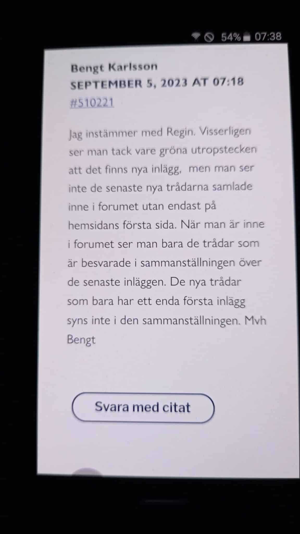 september 5, 2023 kl. 07:18 #510221Jag instämmer med Regin. Visserligen ser man tack vare gröna utropstecken att det finns nya inlägg, men man ser inte de senaste nya trådarna samlade inne i forumet utan endast på hemsidans första sida. När man är inne i forumet ser man bara de trådar som är besvarade i sammanställningen över de senaste inläggen. De nya trådar som bara har ett enda första inlägg syns inte i den sammanställningen. Mvh Bengt
