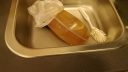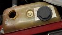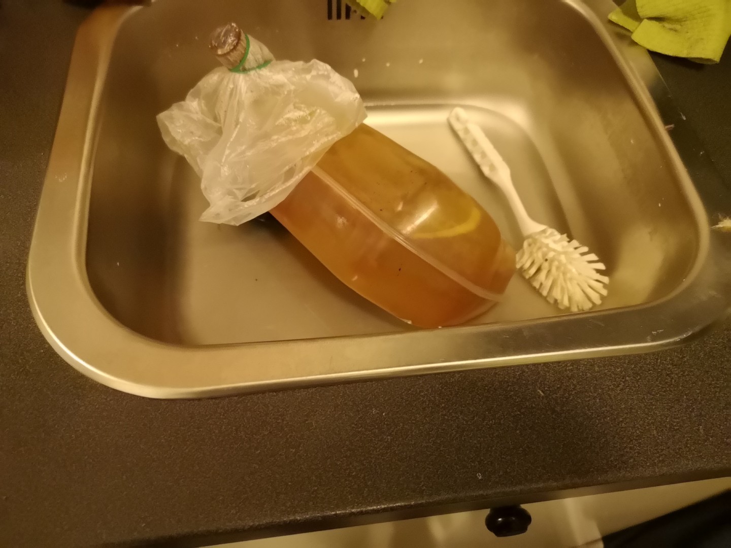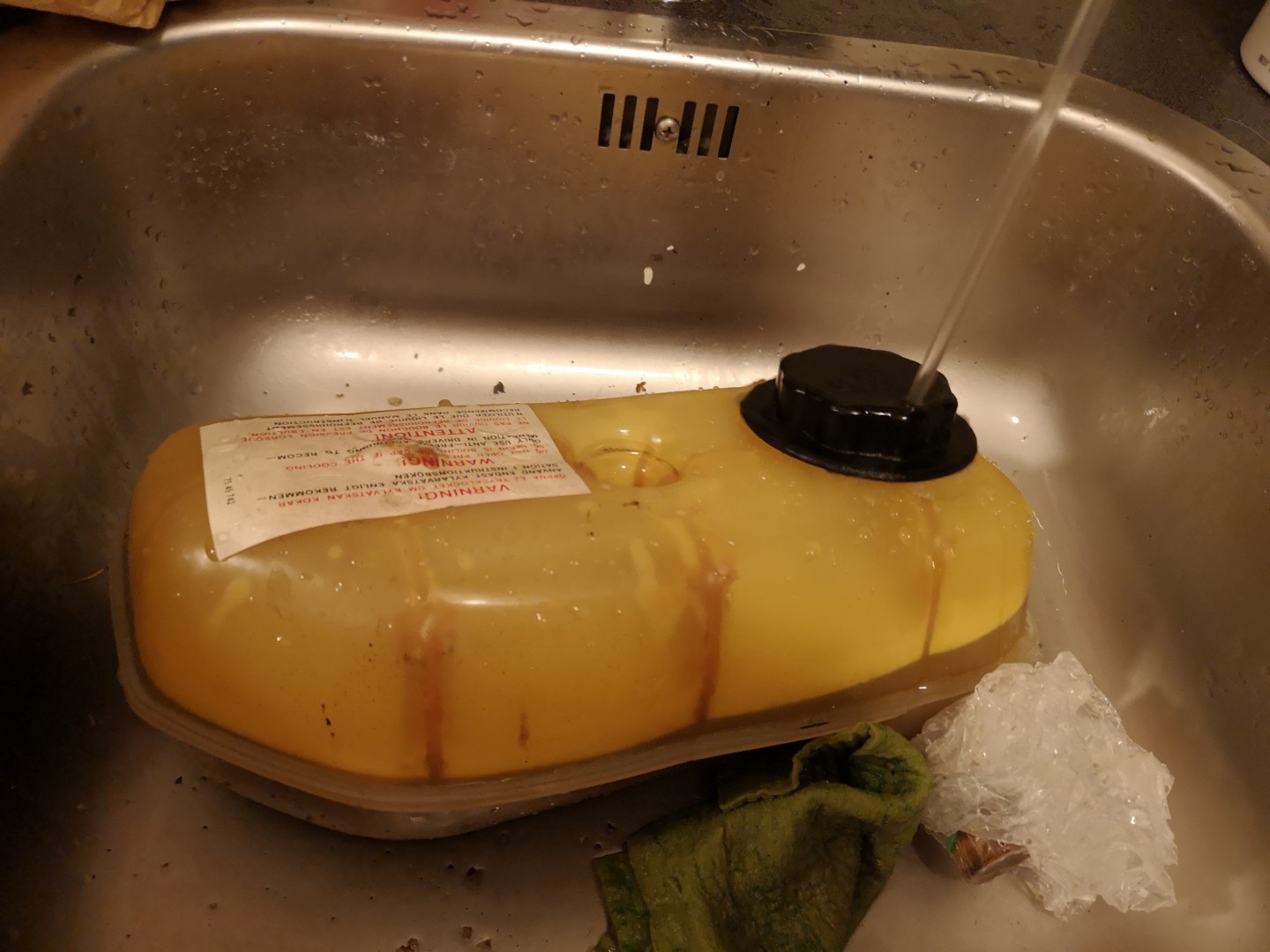 Men jag har haft loss kärlet och låtit det ligga över natten med maskindiskmedel i. Idag har jag skakat det med grus i och resultatet får jag nog vara nöjd med. Det är ju fortfarande lite gult men bromsvätskebehållaren och spridarslangarna har oxå gulnat med åren.Kärlet efter en natt med diskmedel.