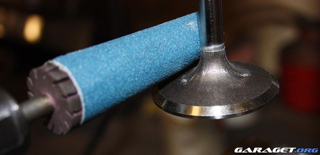 Ventilen sitter i pelarborrmaskinen och så slipar vi av radien som är på ventilen ner mot anläggningsytan för bästa flöde.
