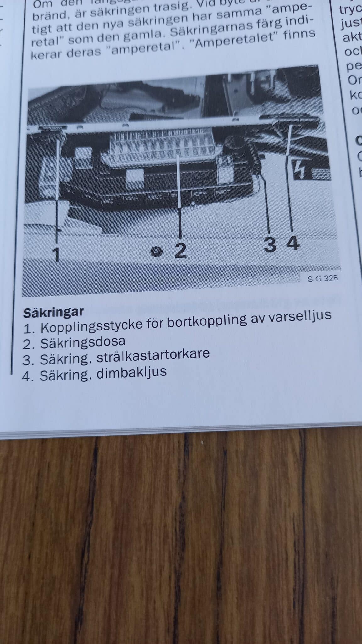 juli 23, 2024 kl. 19:18 #516576Hej. Enligt instruktionsboken ska det finnas ett kopplingsstycke nära säkringsdosan , nr 1 på bilden, som används för att koppla bort varselljus. Kanske glappkontakt där? Annars testa med annat ljusrelä? Mvh Bengt