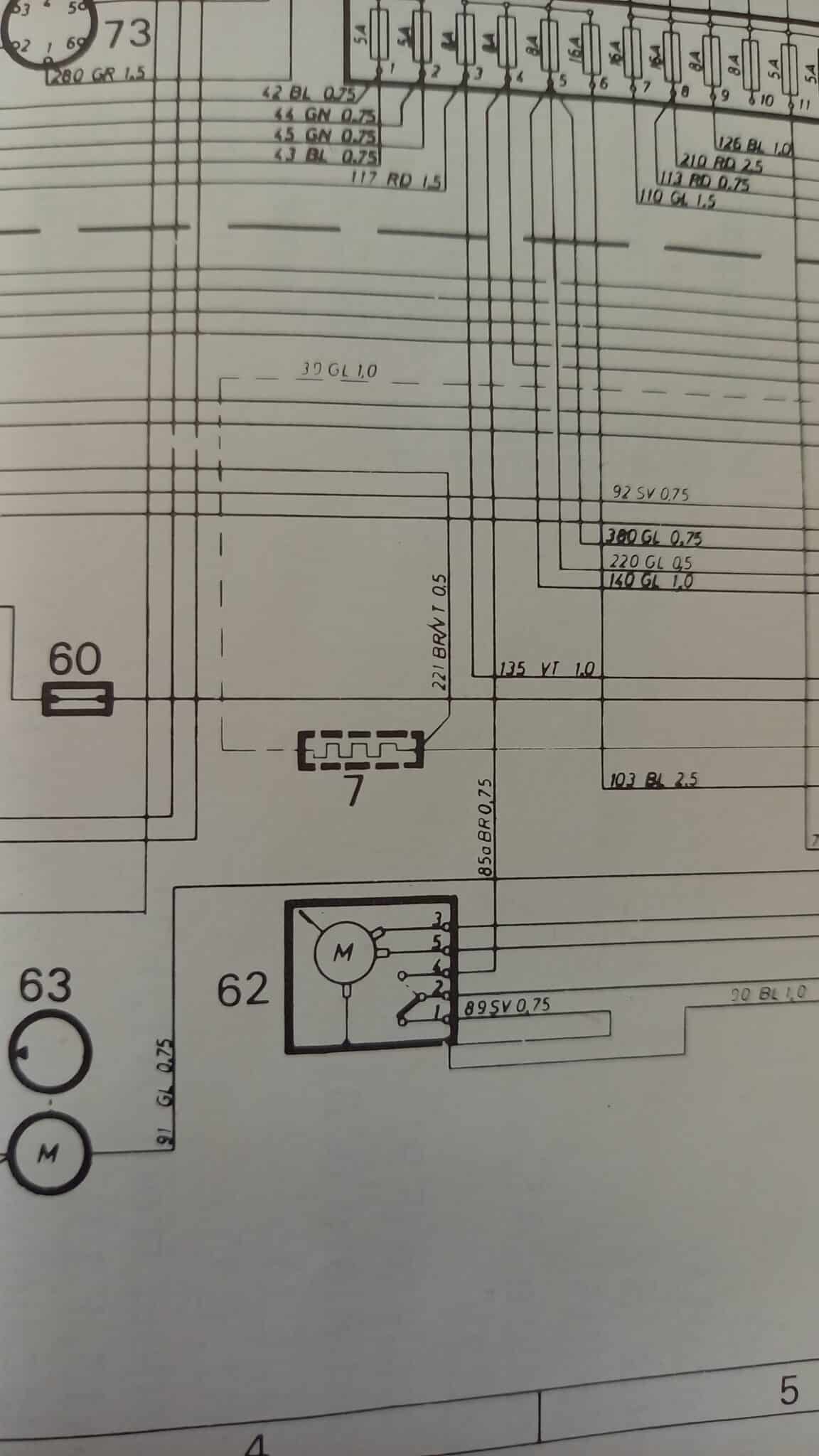 juli 29, 2024 kl. 15:17 #516684Det ser ut att vara olika på 99 GL -79 och 99 turbo-79 men på kopplingsschema för GL så är det en streckad gul kabel från samma stift som grå kabeln på reläet och den gula kabeln ser ut att gå till ett motstånd, nr 7 på bilden, och vidare därifrån går brun/vit kabel enligt schemat. Kanske det motståndet kan vara en felkälla? Lycka till. Mvh Bengt