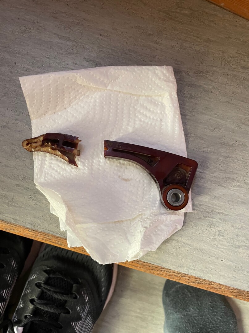 Kollade upp drivningen av vattenpumpen, och fann att verkstaden missat att se att kedjan hoppat förbalansaxel och vattenpumpen, spännarens linjal hade spruckit och gått av.