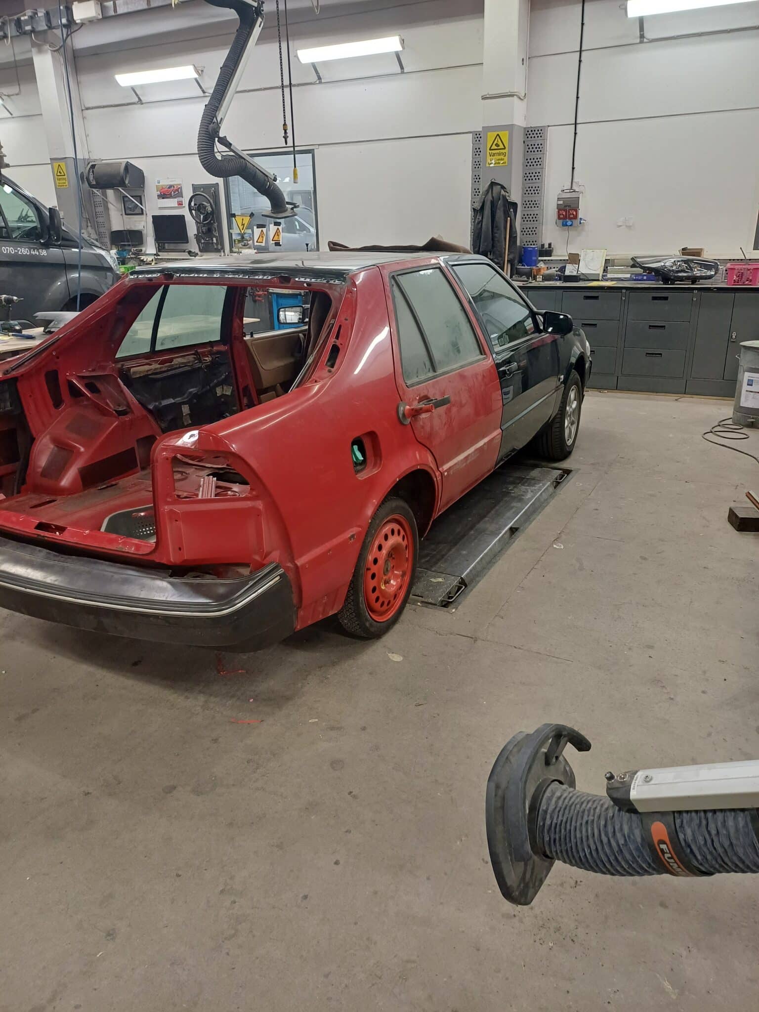 Ja nu har jag blivit av med dels problemet med att det rostade innefrån i höger bakskärm efter en mindre bra reparation efter trolig påkörning innan jag köpte den 1998 som inte gått att åtgärda grundproblemet med. Dels fått min gamla garage lagning av vänster framskärm bytt, visserligen roststoppad men lackningen blev inte osynlig. Även lacksprickor i höger framskärm är nu ett minne. Kan lyfta bilen i domkraftsfästena igen utan att framgolvet buktar. Mm mm, så i princip en ny 9000 i karossen har jag vilket inte växer på träd längre 🤗❤️