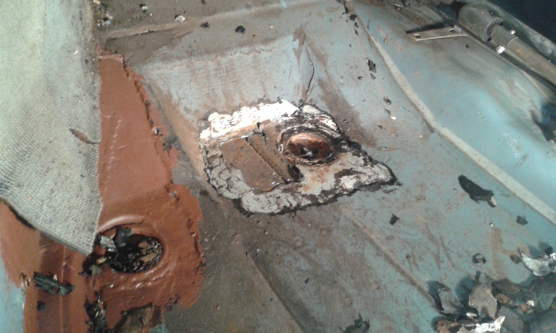 När jag rostskyddsmålade lagningarna i golvet såg jag att även vänster sida hade en bula i golvet. Fram med hackspetten, den här gången gick den inte igenom golvet men det var en hel del rosthål i golvplåten ovanför förstärkningsbalken, lite lättare att laga.