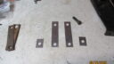 De skruvar som sitter underifrån i fjäderkonsolerna är låsta med låsplåtar. Jag gjorde nya såna med de gamla som mall. På de gamla plåtarna till vänster kan man se att hålen är olika stora, det finns två olika dimensioner på skruvar beroende på årsmodell. Mer exakt så kom de grövre skruvarna vid ch.nr 5901.
