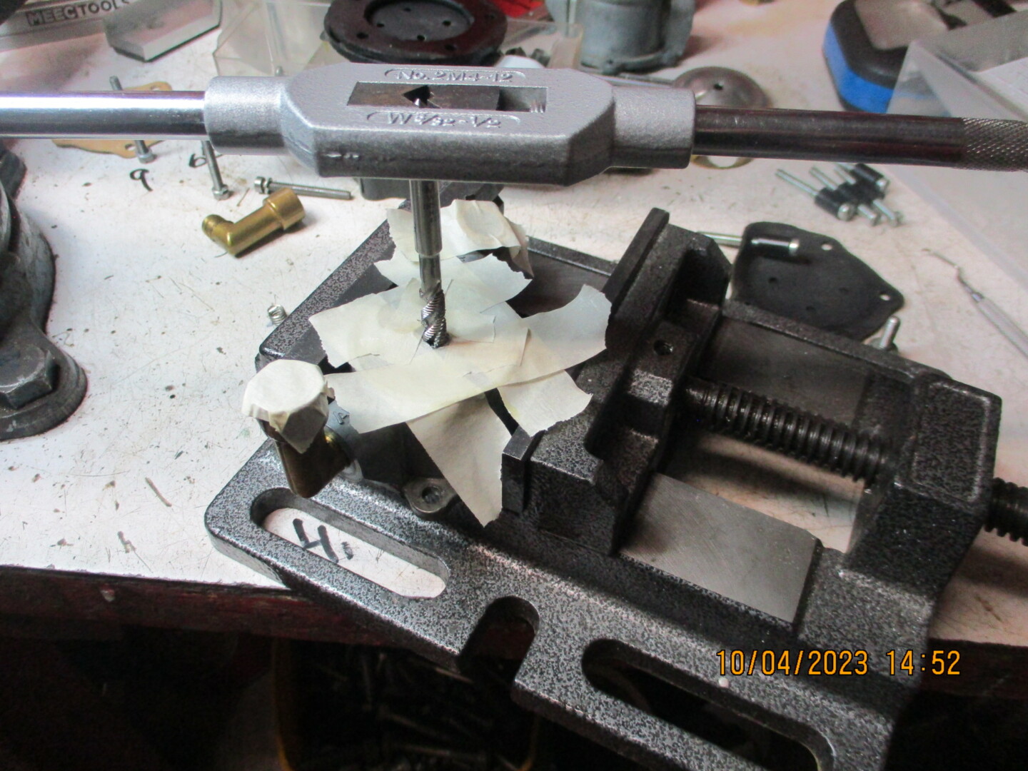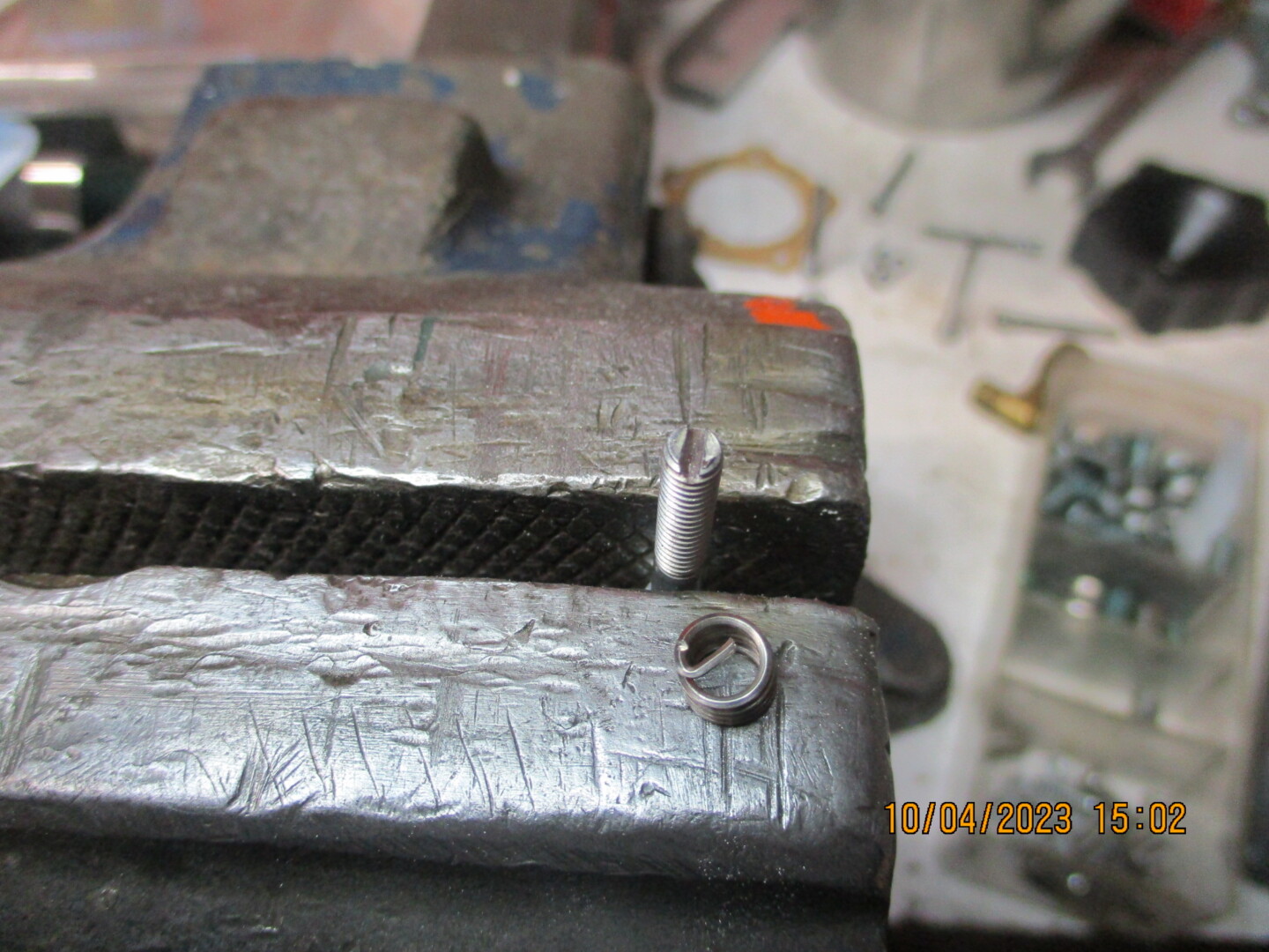 Den trasiga gängan för lockskruven uppborrad och gängas för Heli-Coil.