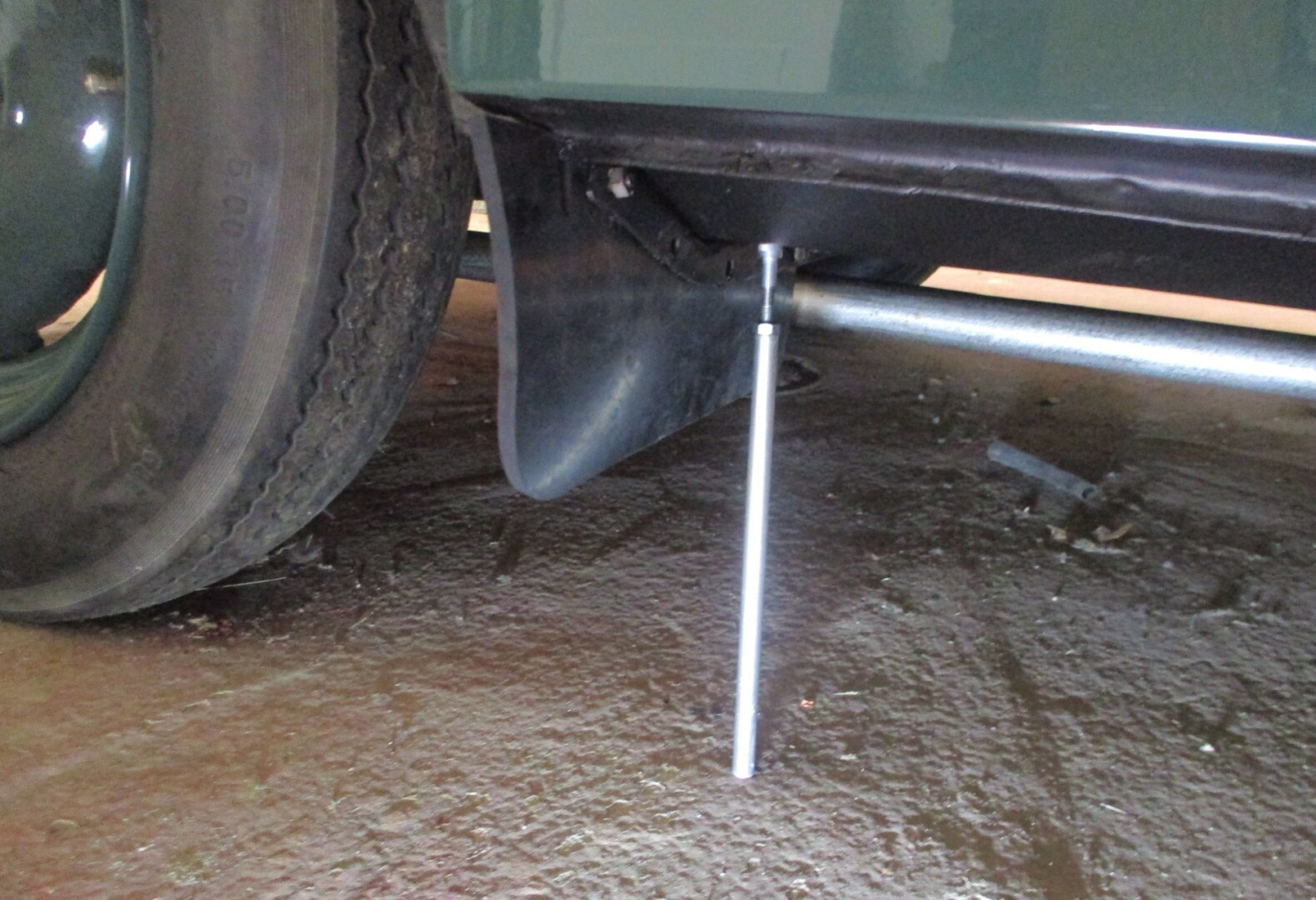 För att få en uppfattning om hur stänkskydden kommer att hamna i höjdled behöver bilen ha rätt höjd och en tillfällig injustering av höjden gjordes. 92:ans torsionsfjädring har inställning för varje hjul. Inställningen kommer att behöva göras om när allt är tillbakamonterat på bilen och den blivit tyngre. Gjorde ett par mätstavar för att lättare kunna kolla höjden när man håller på att justera.Justering av fjädring. Blocknyckeln på första bilden sitter på justerskruven för höger bakhjul. På andra bilden sitter nyckeln på skruven till höger framhjul.