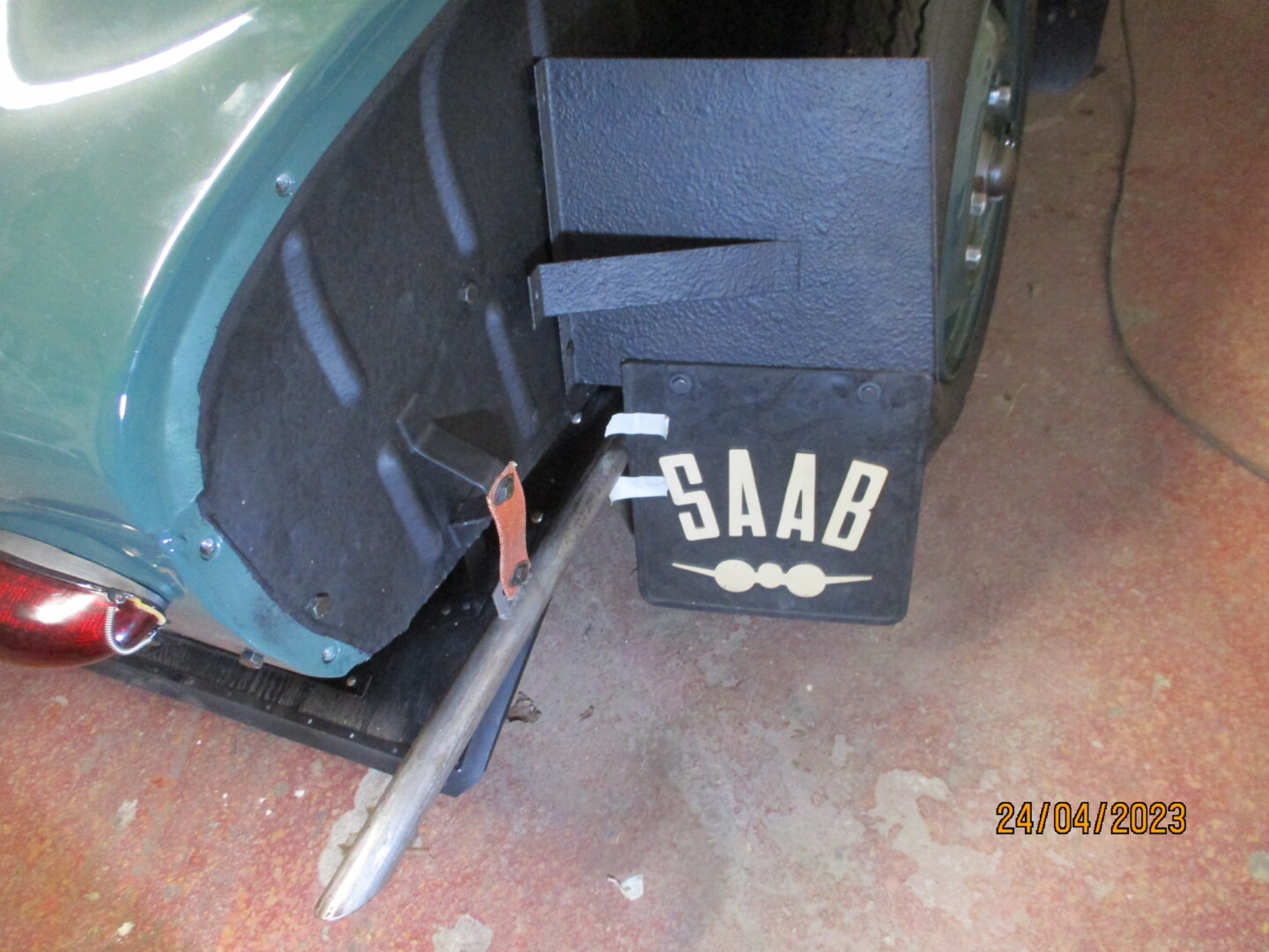 Efter något år av 92:ans tillverkning kom det stänkskyddsfästen som såldes som tillbehör av SAAB. Jag hade ett par såna och bestämde mig för att använda dem tillsammans med den tidiga bredare typen av SAAB-stänkskydd som fästena är avsedda för, fäste och skydd har samma c-c mått mellan de två fästhålen. På de nyare skydden sitter skruvhålen tätare ihop. Ett alternativ om man ska ha skydd monterade är att använda universalskydd eftersom det var vad som fanns innan de SAAB-märkta skydden kommit. Vi får se vad det blir för alternativ i slutändan. Fästena blir i alla fall monterade.
