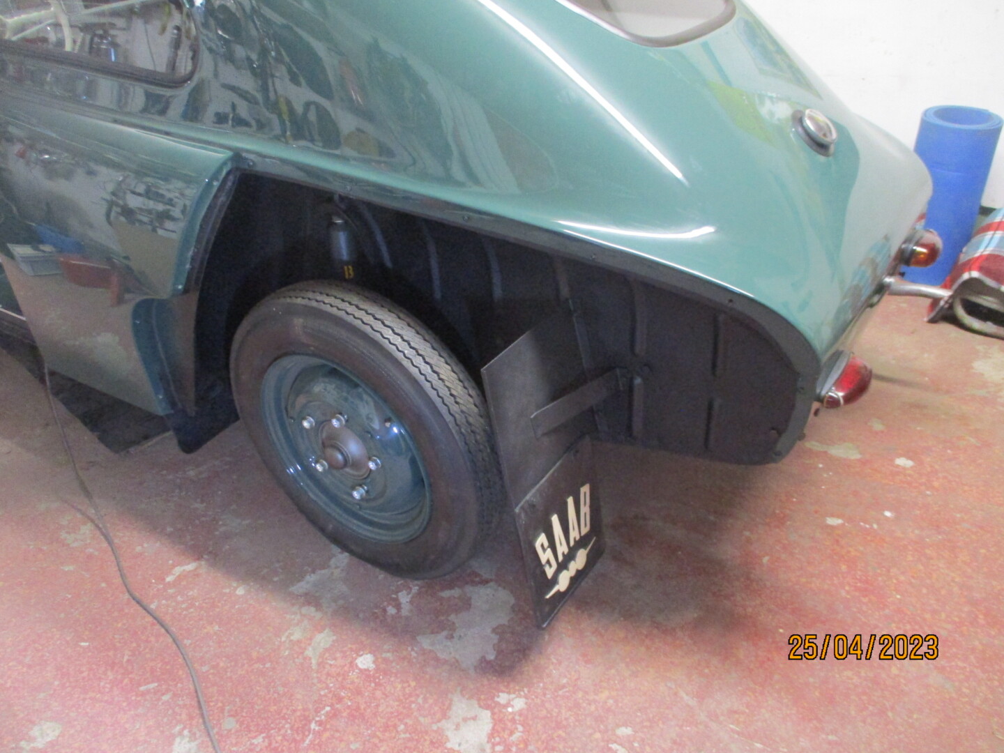 Hade funderat på hur jag skulle göra med stänkskydd bak. 92:orna hade inte stänkskydd monterat original men de flesta bilar på den tiden (50-tal) hade skydd monterade och det satt också på den här bilen när jag köpte den 1978. De skydden var monterade i plattjärn mellan hjulhus och skärm.