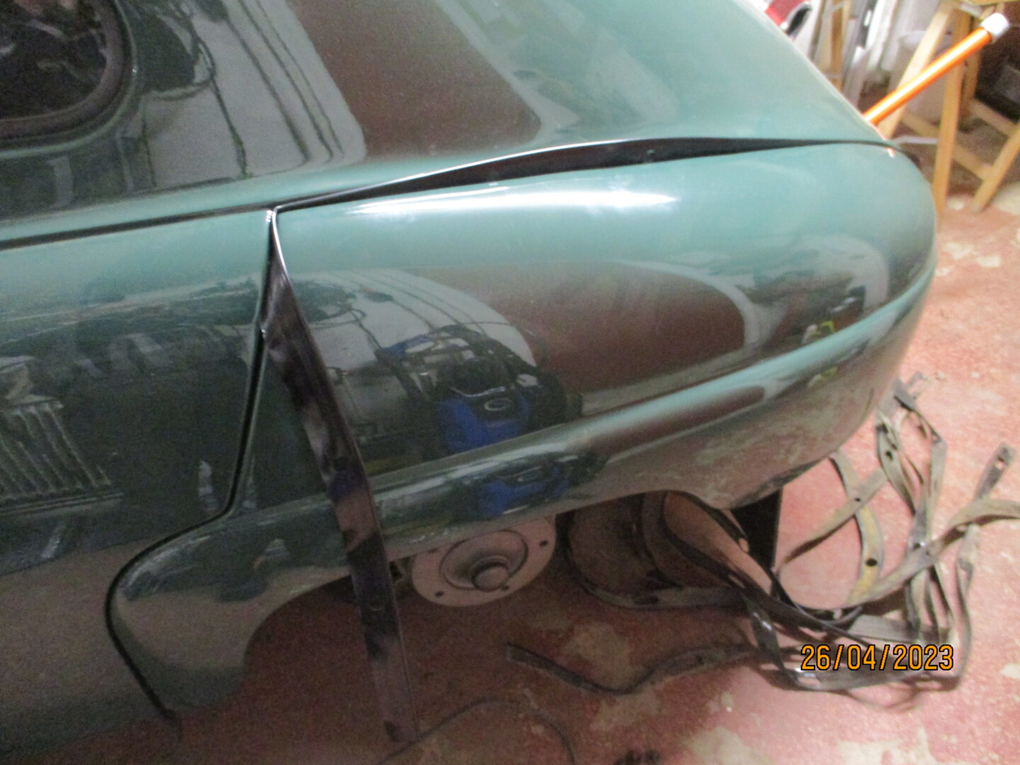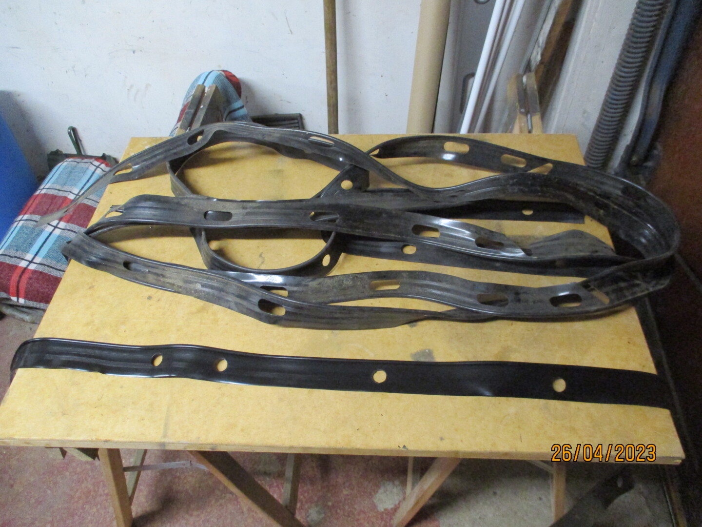 Dags att montera skärmar och leta fram kederlister till dem. Hade en del NOS kederlister som legat undanlagda länge och en koll visade att vissa var märkta med reservdelsnr, andra inte. Det var i första hand till bakskärmarna jag skulle ha lister och det fanns några lister med runda hål som skulle kunna stämma om man gjorde hålen ovala som på listerna till framskärmarna. De runda hålen stämde inte till 100 procent. Hängde också upp framskärmarna lite provisoriskt utan kederlister, Monterar listerna senare när skärmarna ska skruvas fast ordentligt. Måste vänta med det tills dörrarna är monterade så framskärmarna kan justeras in så att de stämmer mot dörren.