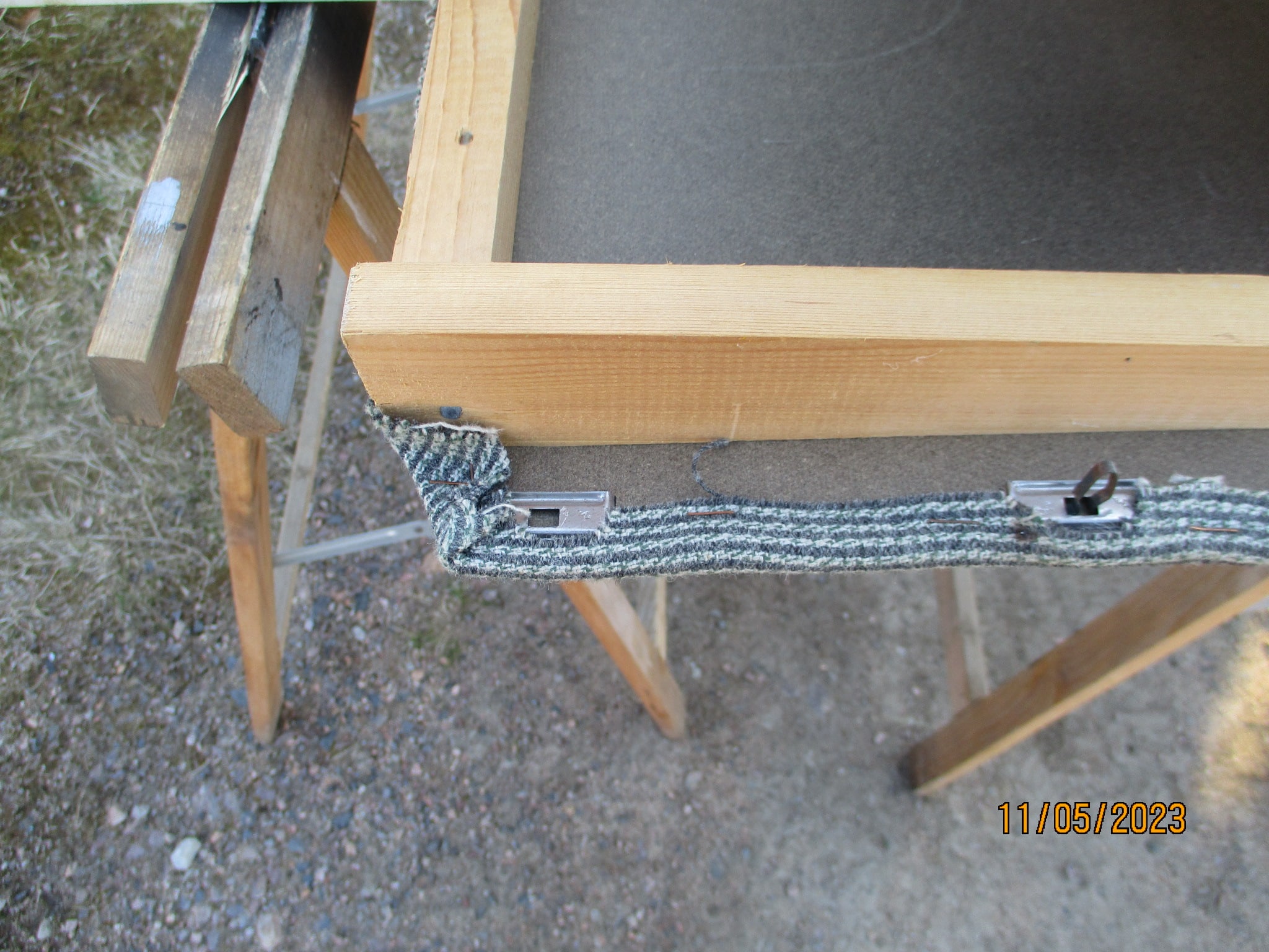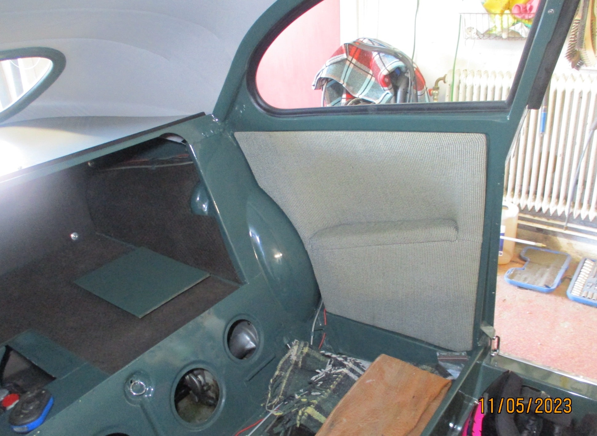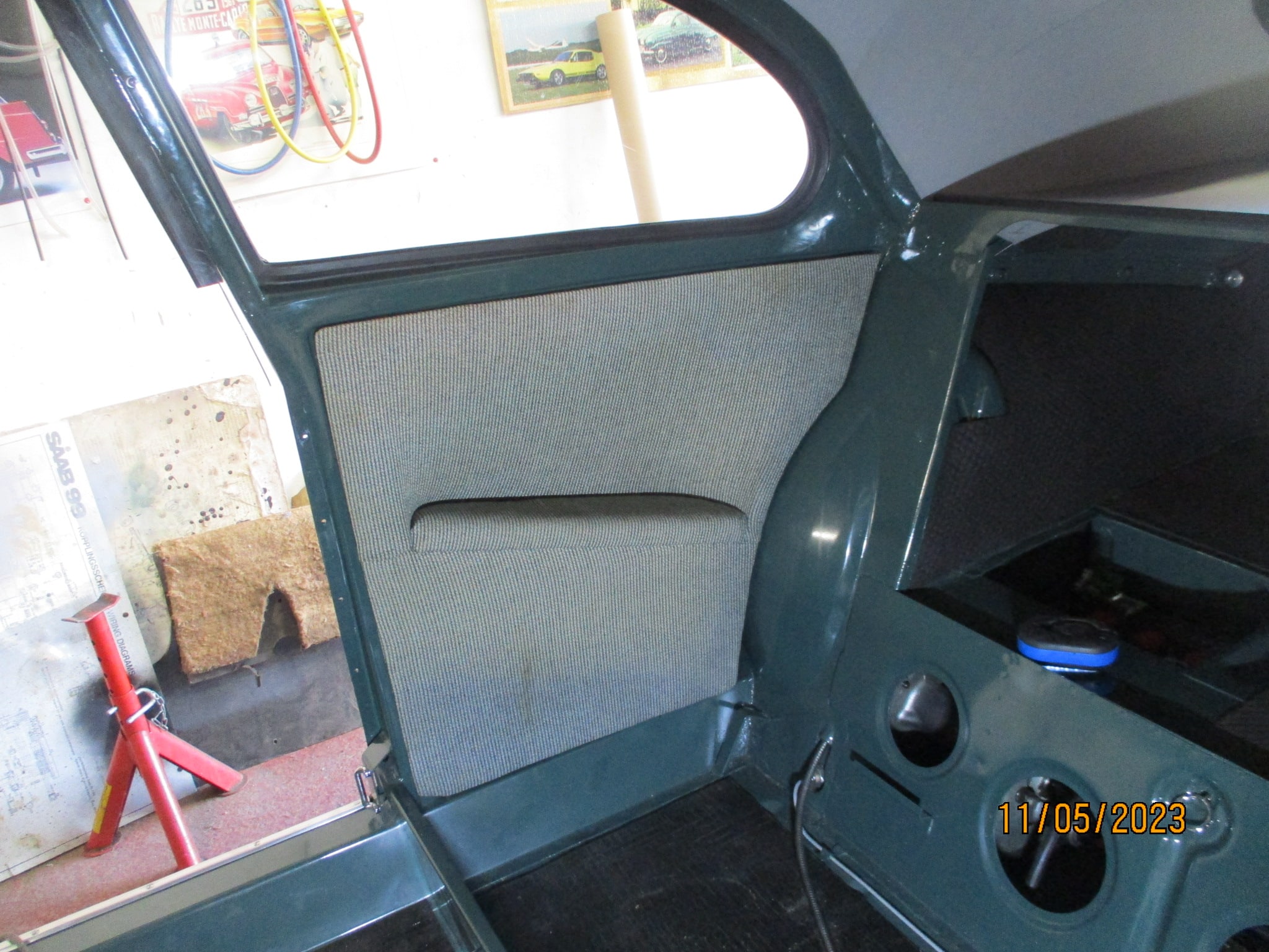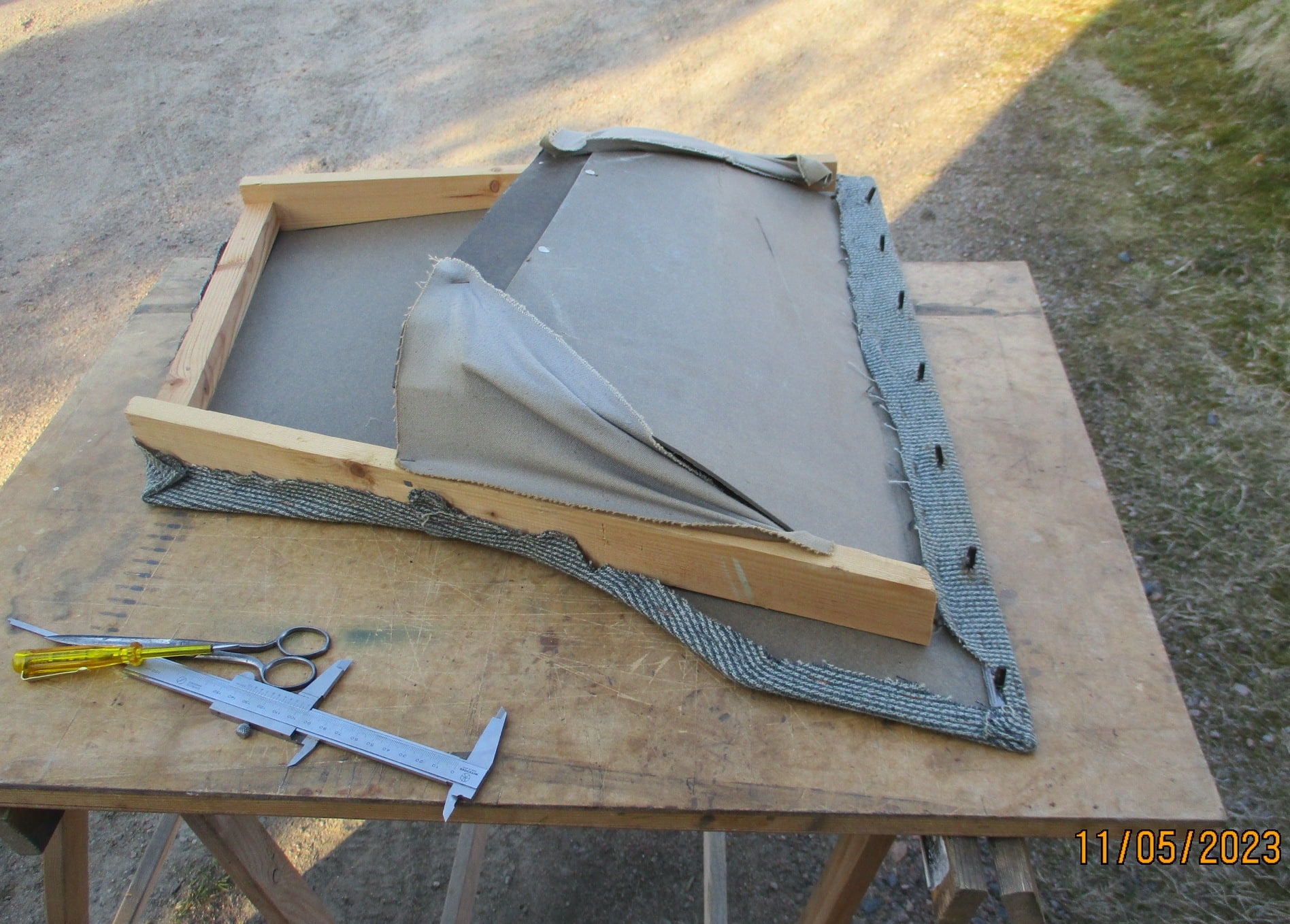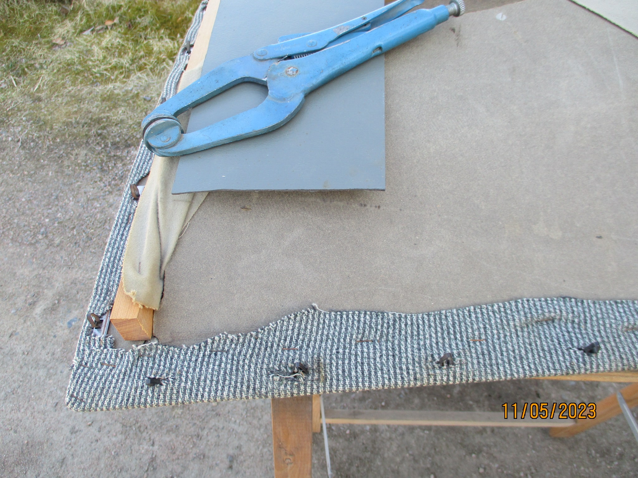 Klädselns bakre sidostycken på gång. Jag kommer att använda originalklädseln som den är. Det finns inga skador eller speciellt märkbara fläckar men det syns att tyget fått en mer gulaktig ton jämfört med de ställen som suttit skyddade. Just nu får det vara som det är, jag får se om jag testar någon typ av rengöring senare. Jag har nytt tyg om jag skulle vilja klä om men behåller helst originalklädseln.