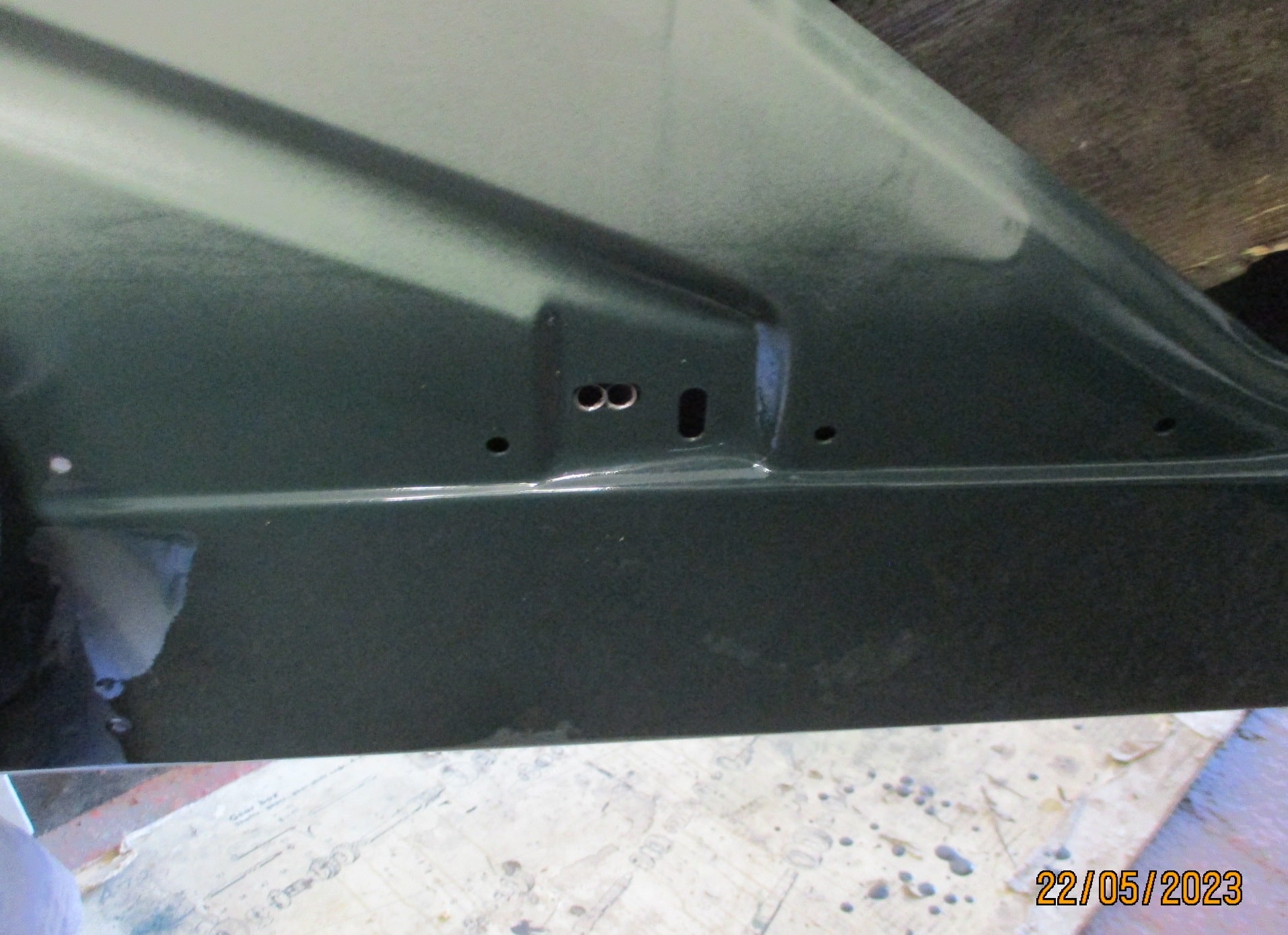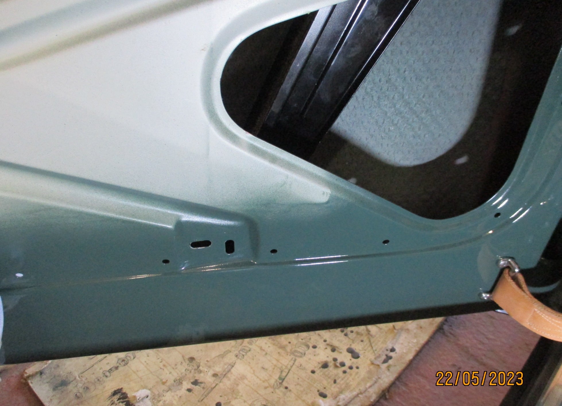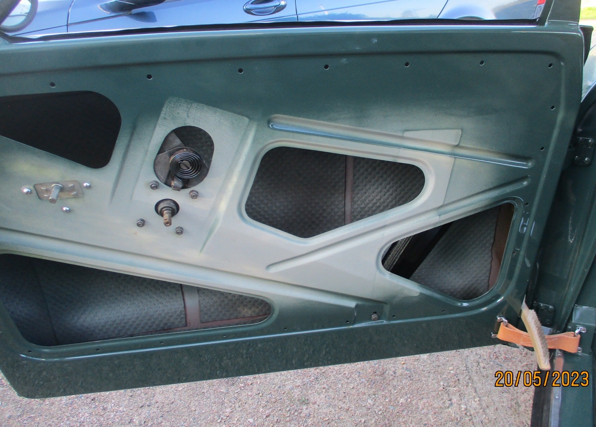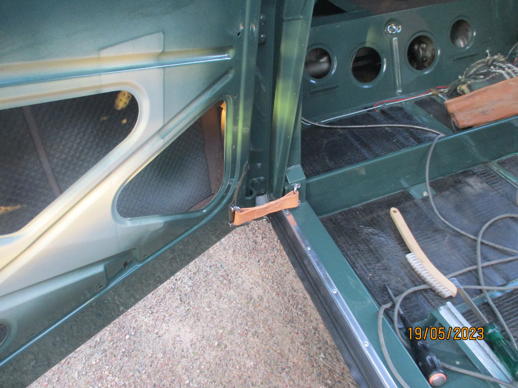 Dörren hängd på plats, däcket var lagom i höjd att ställa dörren på när skruvarna till gångjärnen skulle skruvas i karossen. Passningen mot skärmen får justeras senare när skärmen ska skruvas fast för gott. Dörrstoppen (läderremmen) är också ditsatt så man inte riskerar att dörren går upp för långt och går i karossens sidostycke.