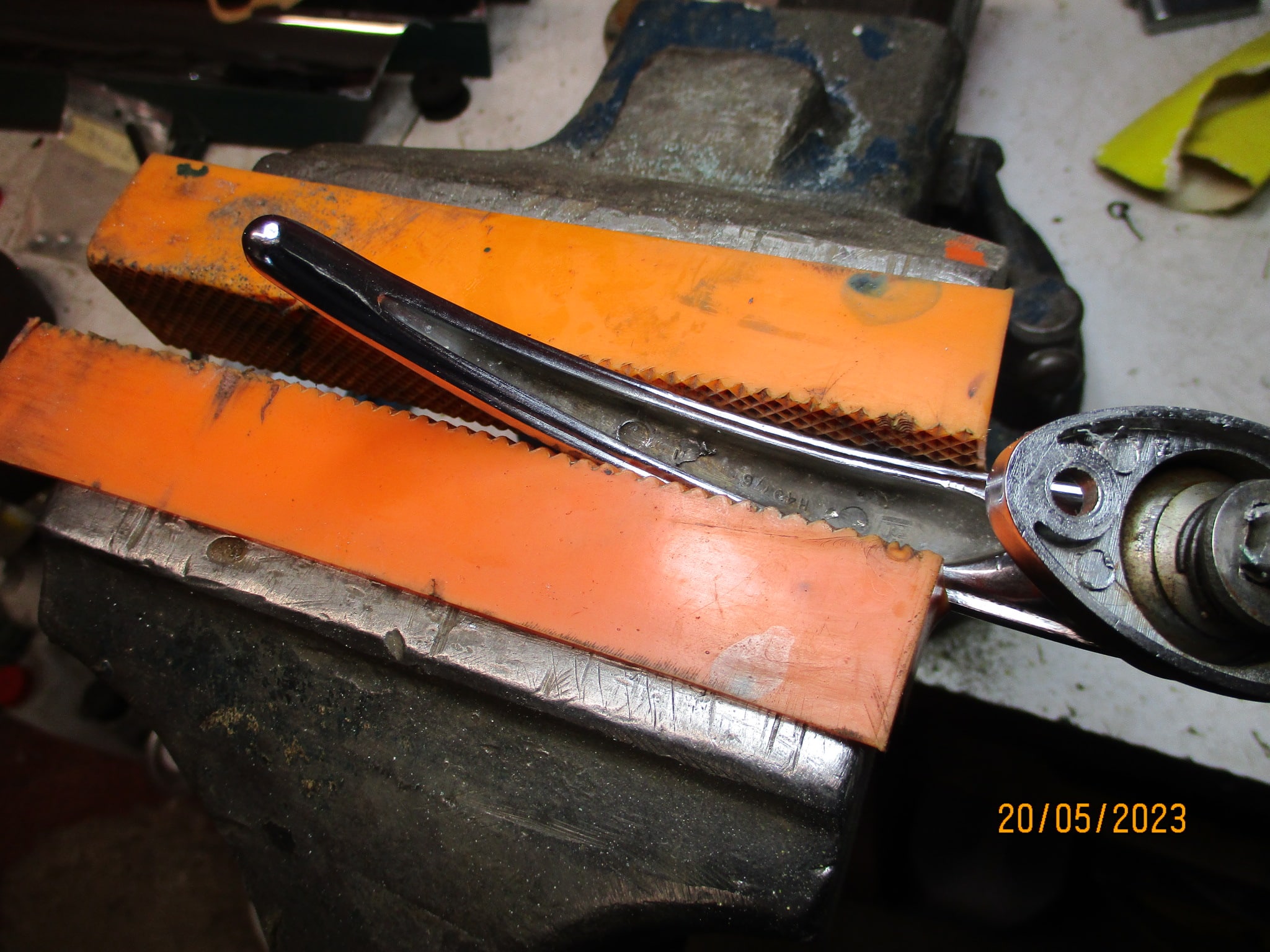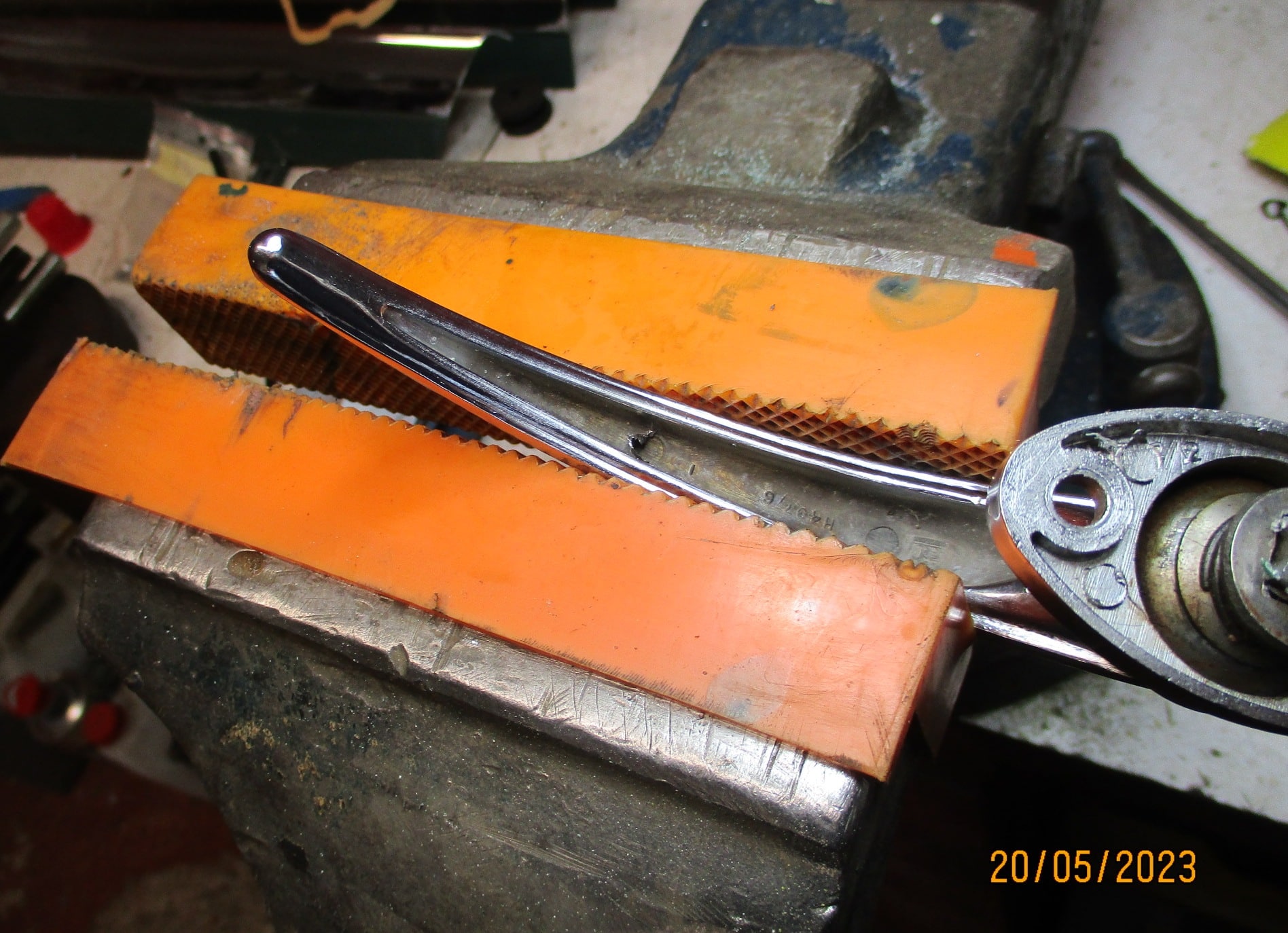 När ytterhandtaget var monterat kändes det vasst på insidan när man tog i det. Svårt att se med handtaget monterat, men när det blivit borttaget igen så syntes orsaken, det satt kvar en flisa från gjutningen på insidan. I alla fall ett lätt åtgärdat fel.