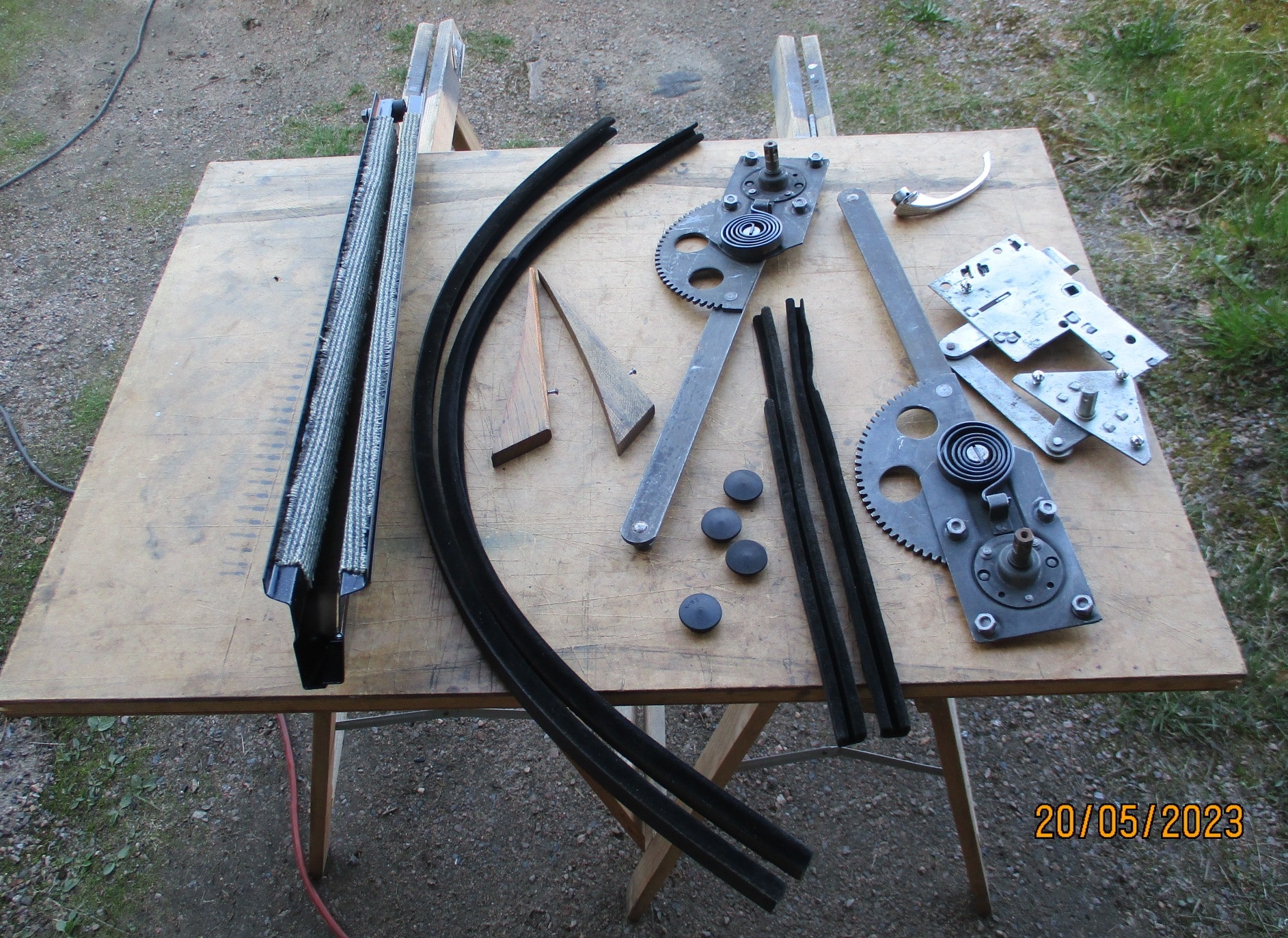 Några fler delar är framplockade för montering i högerdörren. Också några delar till vänsterdörren finns med. Längst till vänster ligger rutskenan som dörrutan löper i när den vevas. Som skydd för rutan har man i produktionen använt samma tyg som till inredningen. Mer om de skenorna finns på sidan 4 i den här tråden.