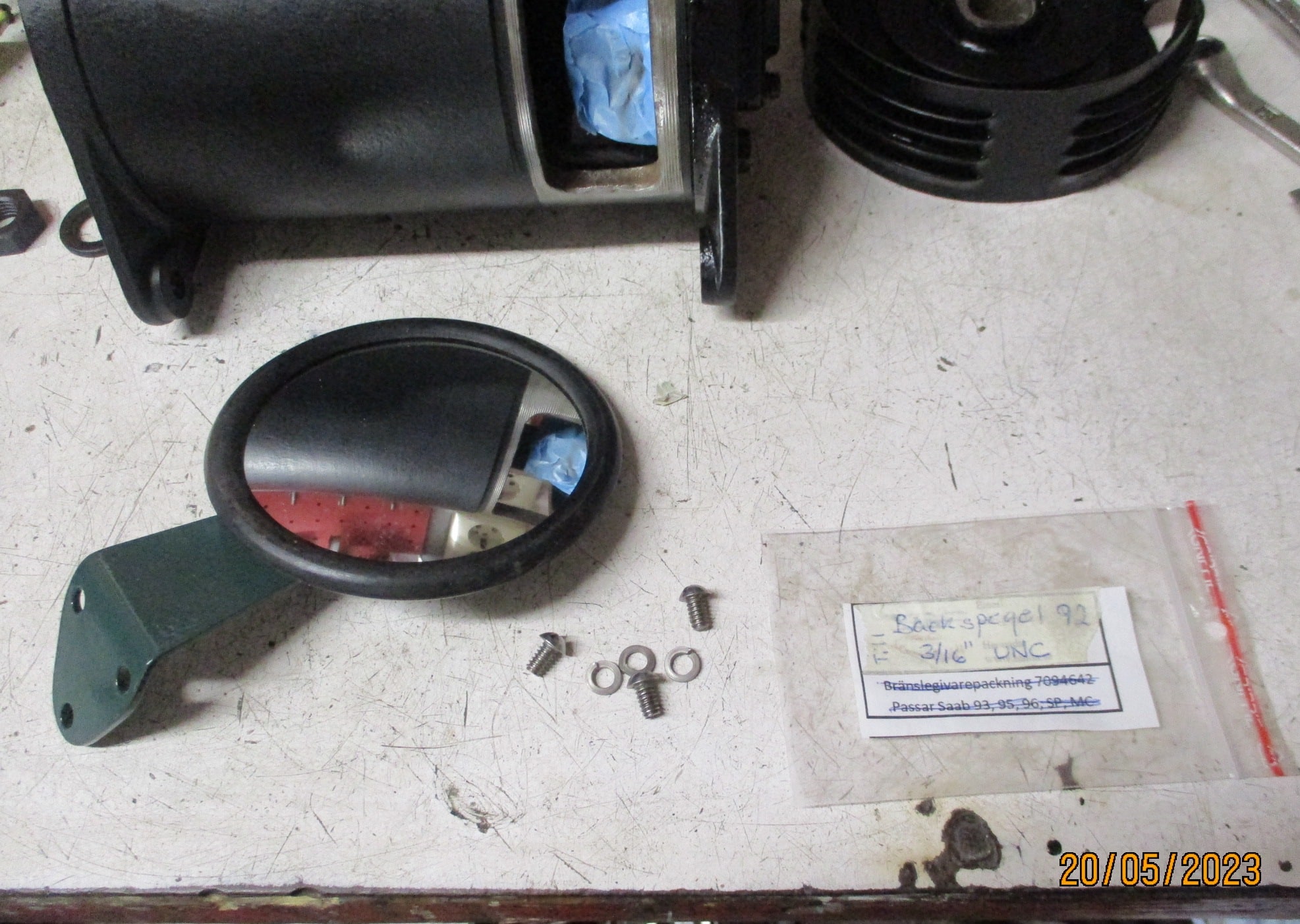 Backspegeln monterad. Vid en snabb titt så ser spegeln ut att vara ett vanligt planglas men originalglasen till de här speglarna är konvexa.