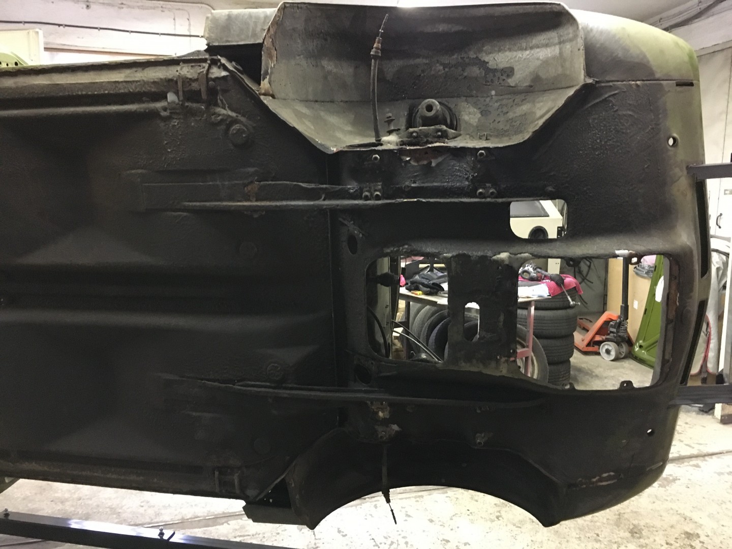 Nästa moment i plåtverkstaden är att karrossen ska upp i den sk ”vaggan”. Gissar att axlar länkarmar etc blästras vid sidan om. Ska åka ut till Ari & Jari i närtid. Återkommer med rapport.