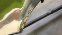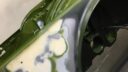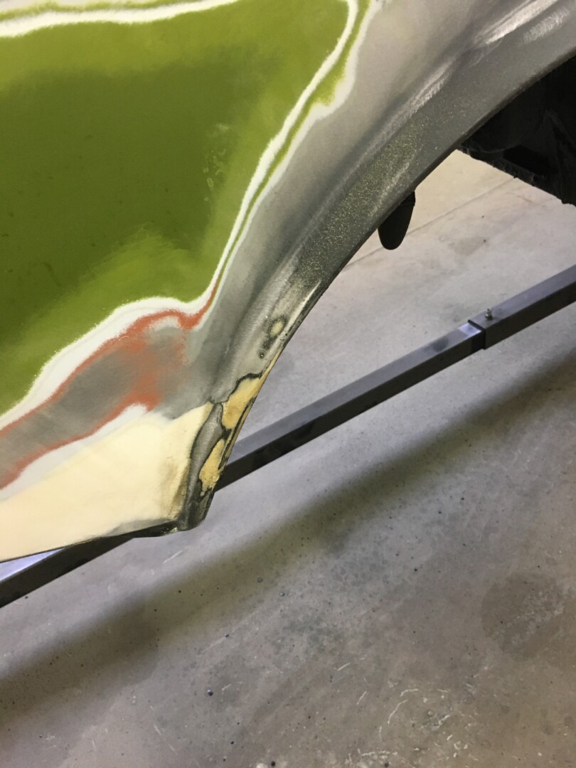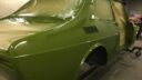 Från innerskärmen sett bakre droppkant hö sida ilagad. Samma säk hör ekonomiplåt finns inte till denna. ”På platslagat av proffs”.Så till sist väljer jag att beskåda glansen på ytan på det omlackerade vänstra hjulhuset. Ari sa att detta är dessutom utan klarlack. Klarlack blir det på utsidan av karossen ovanpå färgen. Ari noterade också att han tyckte att nyansen av färgen var något annorlunda än den jag uppgav (om jag minns rätt var det Veronagrän GN9H)