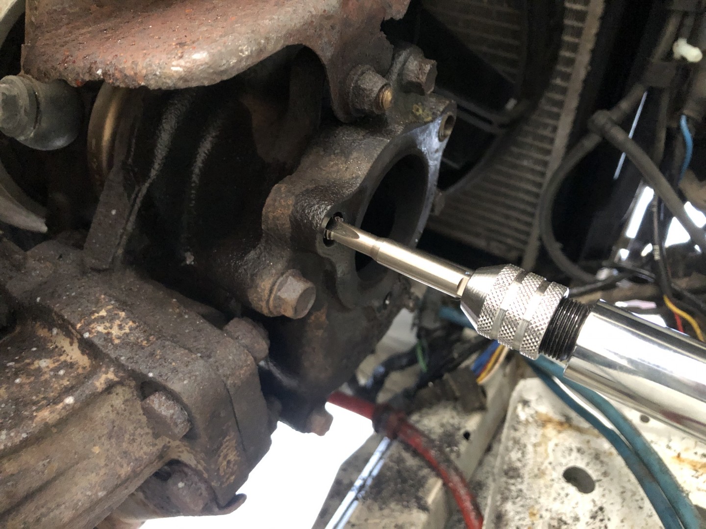 Så på med röret igen för att ta med oss bilen till mekkväll.Jag borrade ur den tredje pinnbulten, samt gjorde fint med gäng i de andra.