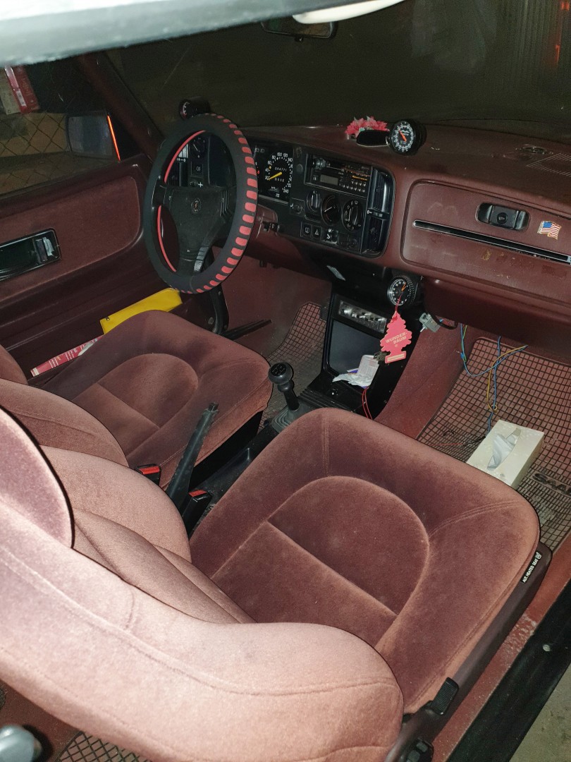 Vinröd lyxplysch var ju standard på de svensksåla 84-85 aerosarna, klädseln ser riktigt fin ut. Den randiga tejpen är nog tidstypisk den också.Ha det gött, Sven