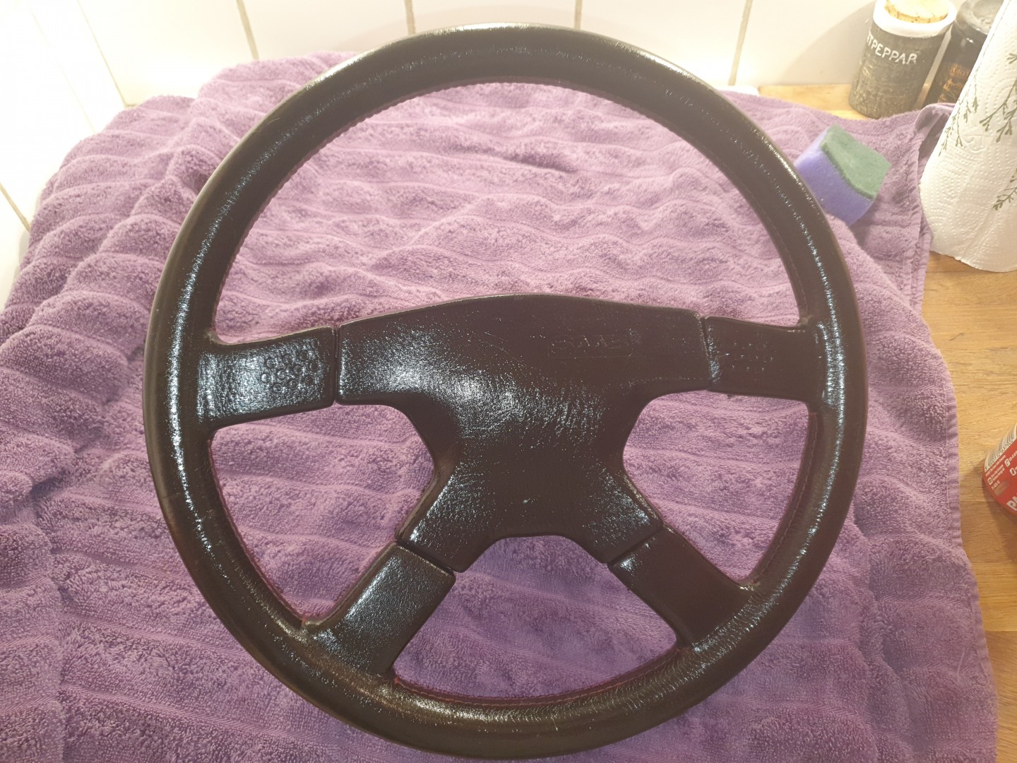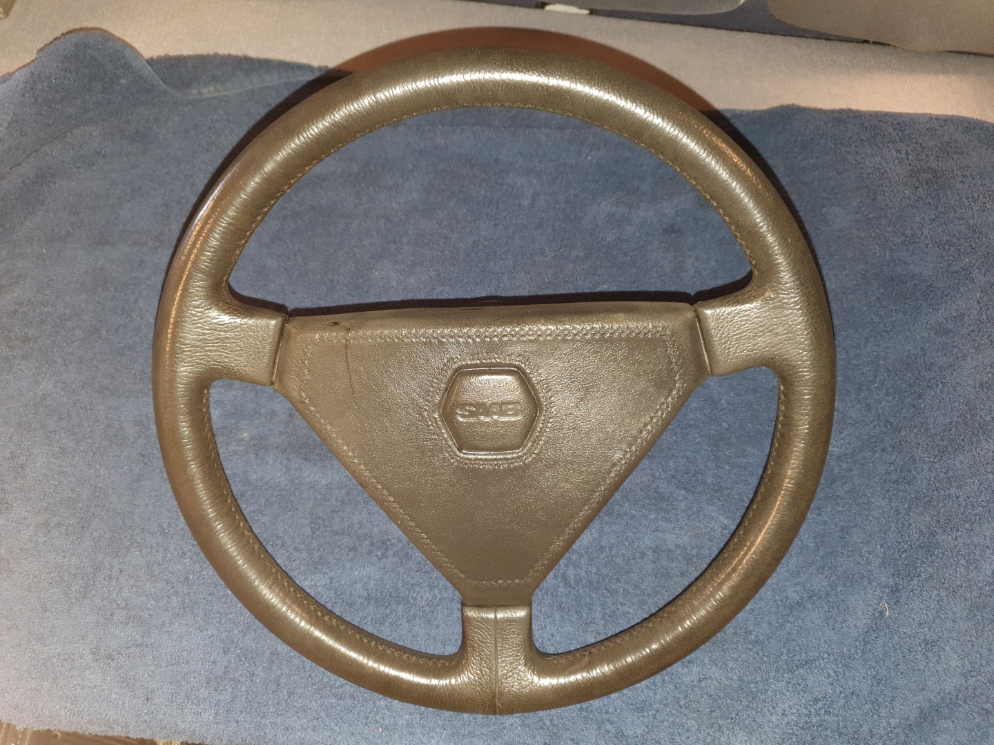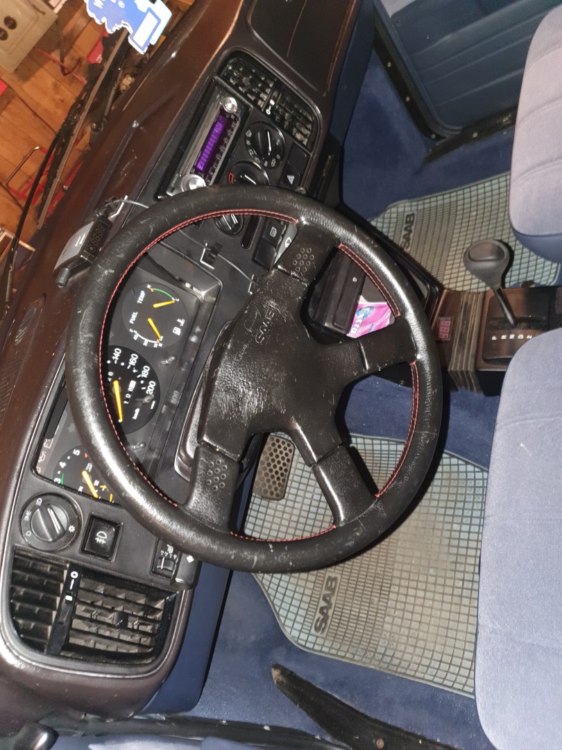 Sen igår var ja å hämtade ett lass med saab 900 delar i Trollhättan… å ibland de delarna en nästan oanvänd skinnratt från 80 talet.. hängt på väggen i över 30 år… jag hittar inget slitage på den å den röda tygsömmen ä som ny.. den åkte in i min 900med.. så nu är min turbo ratt till salu om nån är intresserad…den ä i nyskick.. lägger in ett kort på den längst ner..