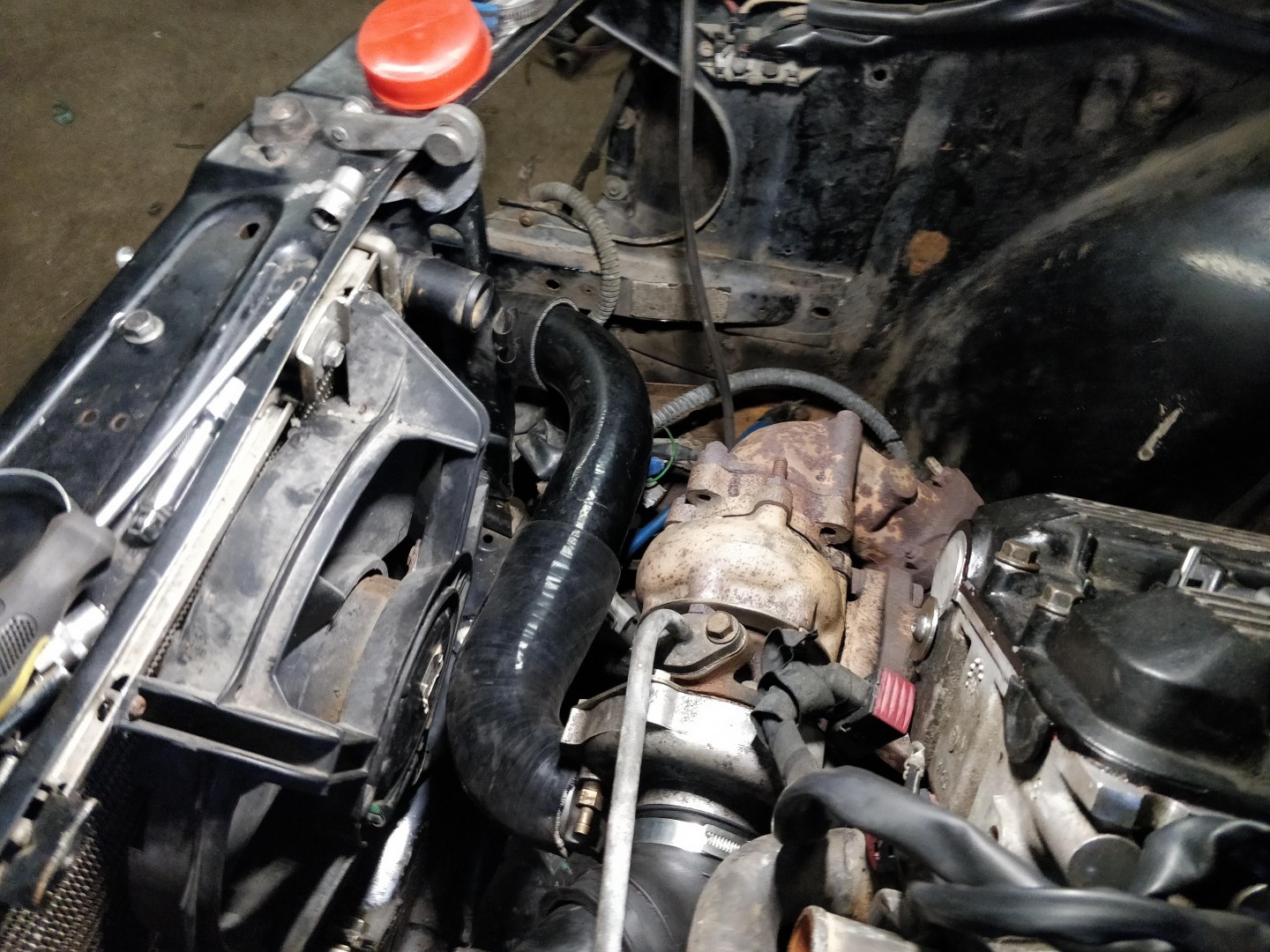 Turbo sidan. Slangen ligger på lite på fläktens motorhus men över en centimeter från fläktbladen så jag ska testa att köra på denna standardfläkt tills vidare. Gick hur smidigt som helst att dra när turbon var snurrad (oljereturen är monterad och allt åtdraget, utan större problem)