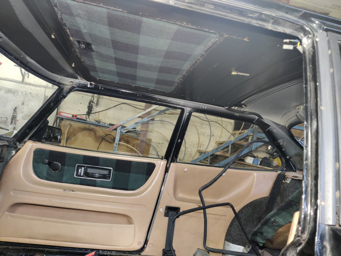 Anledningen till att den Första kranen byttes var att den kärvade lite och reglageaxeln gick av, den enda användbara delen på speedparts kranen var just reglageaxeln. så nu har jag 2 gamla men fungerande saab org kranar…Lite mer demontering slutade i att innertaket lossades. tyget har släppt på något sätt och det blev irriterande när det fladdrade i backspegeln,