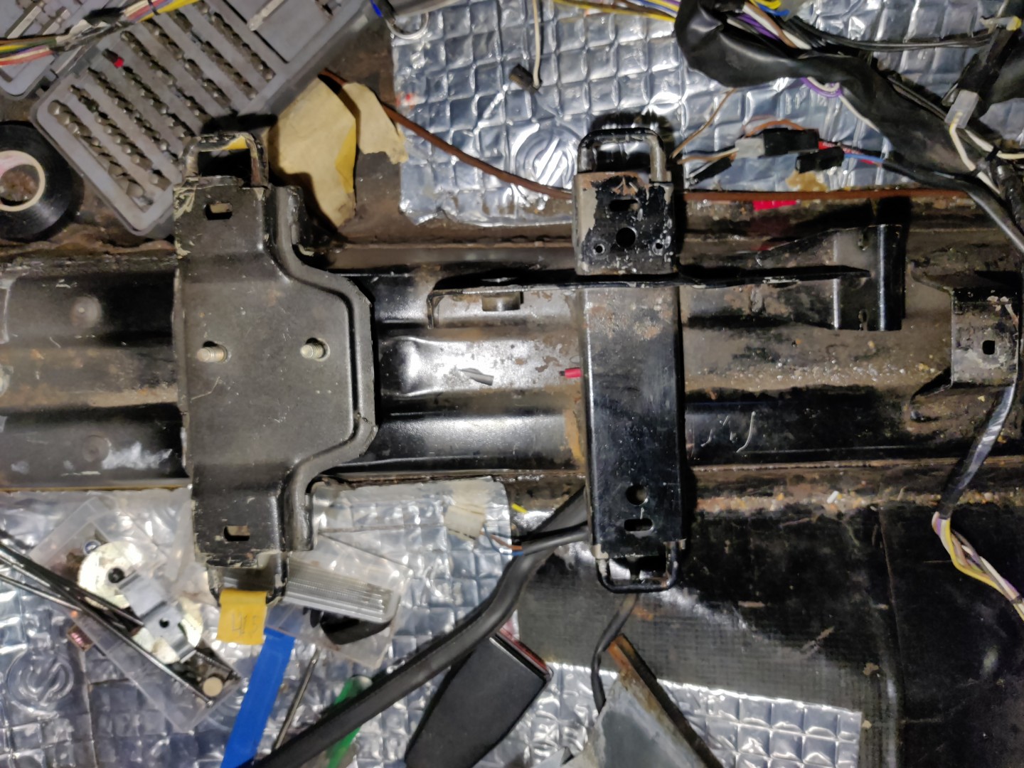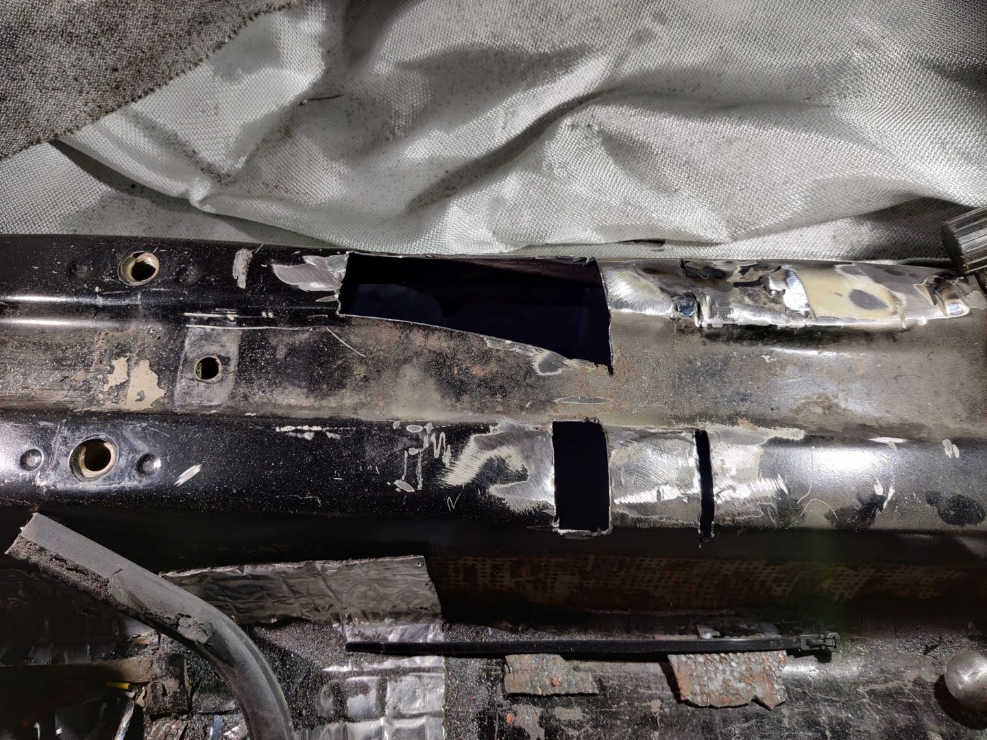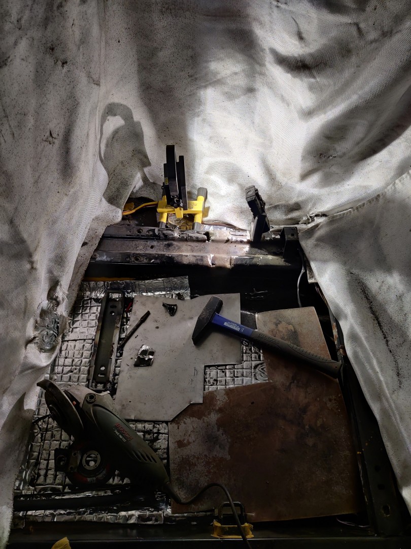 [ x ] * Med inredningen ute så ska jag kapas bort det gamla stolsfästet/handbromsspaksinfästningen och svetsa dit den nya. (kanske gör detta innan jag monterar avgasets främre del för att komma åt under).