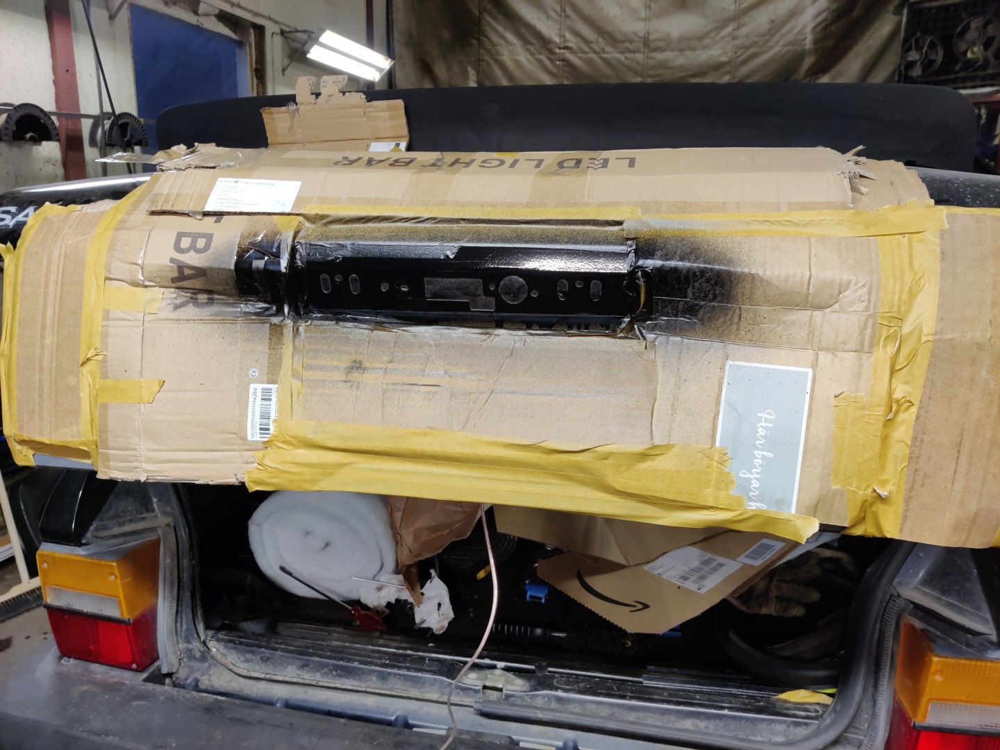 Hade dämparen varit ny (simons 2,5″) hade jag inte brytt mig mycket, men den har mågna hårda år på nacken hos tidigare ägare och är rätt urblåst. en liiiten ökning av ljud är för mycket, och redan idag har den jobbiga toner vid vissa hastigheter. så jag såg mest fram mot en ursäkt till att ljuddämpa lite mer 😛