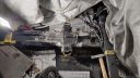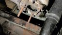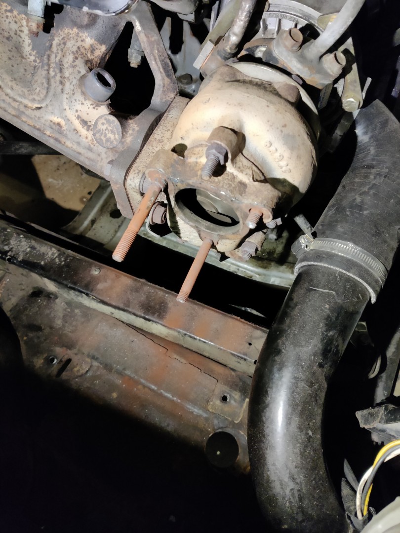 När jag skulle svetsa i avgastunneln tänkte jag att jag tar ner värmeskölden först. Downpipe och biten från downpipe till dämpare skulle ändå bytas mot grövre saker (en extra dämpare ska dit med) så jag lossade vid turbon. Det Ska sitta ett stag som håller downpipen i växellådan och jag hittade resterna av det staget där det slitits av, säkert i krocken som lämnat hela sidan i ett bedrövligt skick.