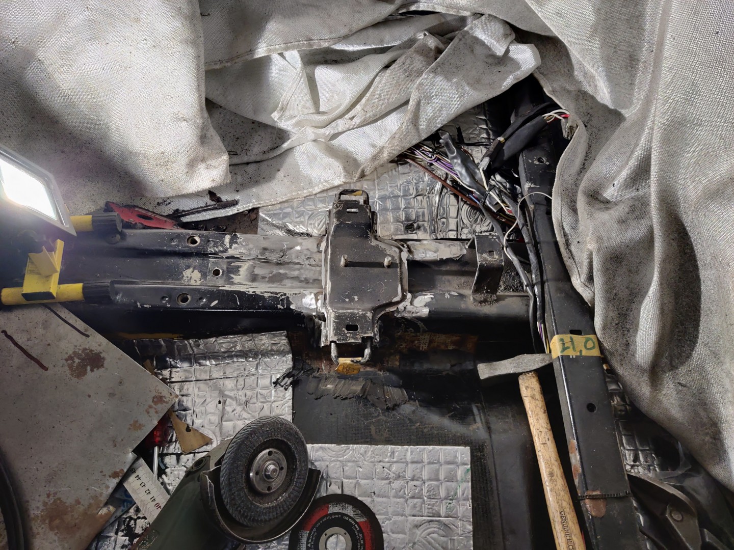 [ _ ] * Med inredningen ute så ska jag kapas bort det gamla stolsfästet/handbromsspaksinfästningen och svetsa dit den nya. (kanske gör detta innan jag monterar avgasets främre del för att komma åt under).