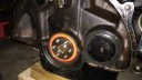 Med motorn ur kan jag också konstatera att täcklocket nog är boven. Jag smetade av någon anledning flänstätning runt locket vid förra lyftet och det hade nu bildats blåsor runt periferin av locket när oljan tryckts ut genom tätningen. Varför jag inte kopplade att locket kunde vara skyldig senast fattar jag inte, det är ju tom skrapmärken i det som visar att det måste ha tryckts ut mot svänghjulet… 🙂