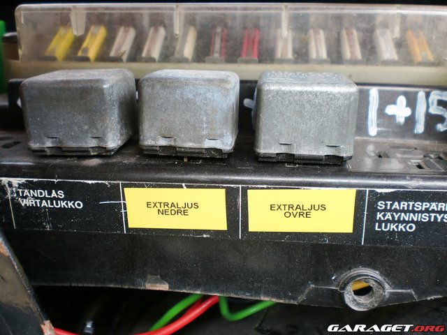Nu har jag monterat huvemblemena,blev bra. Sedan har jag kopplat in alla extraljusen, kopplade dem i par om övre och nedre. så varje par har ett relä med säkring, Reläna monterade jag i orginalsäkringsdosan, fanns två lediga platser som jag stiftade in kablar i. Säkringarna hamnade i den nya säkringshållaren som jag monterat sedan tidigare och hade fördraget med spänning.