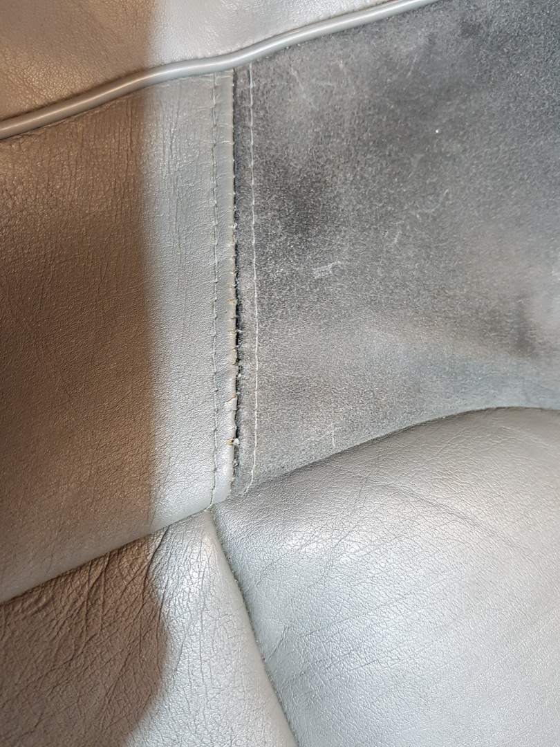 Sömmen och stolsvärmen reparerad samt läder och mocka tillsnyggat. Före/efterbild: