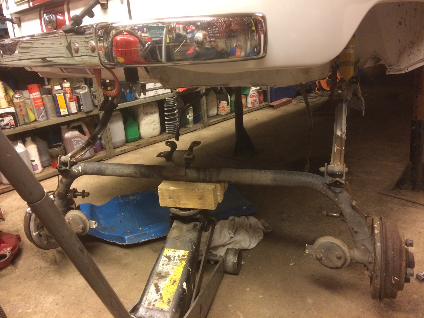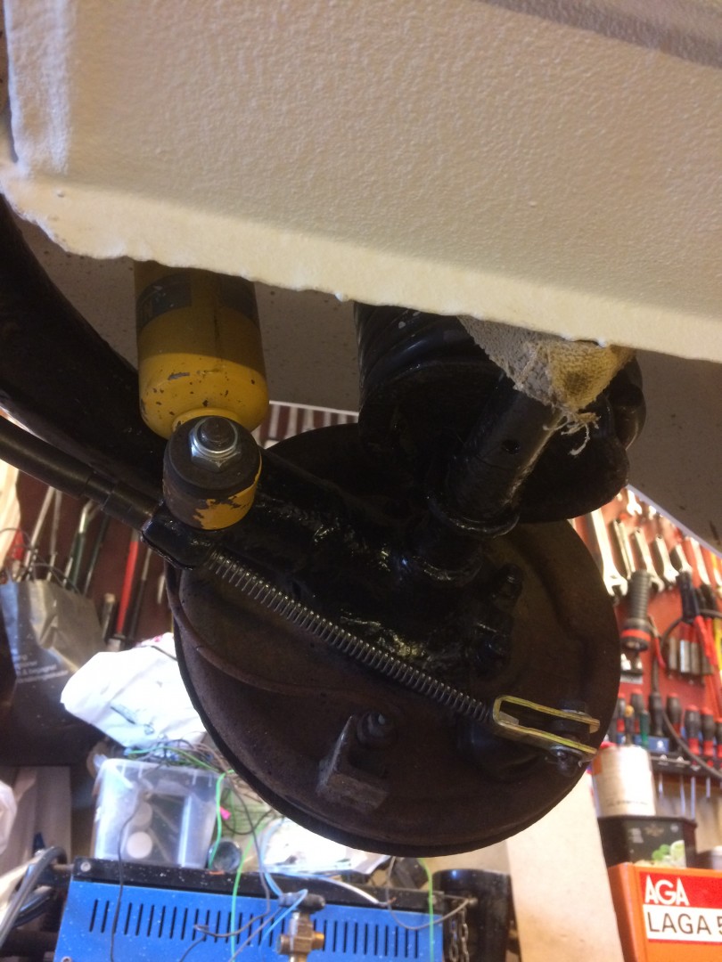 juni 23, 2017 kl. 21:46 #431941Hängde upp bakaxeln igen efter det att ha fixat ytbehandling på bilens undersida. Monterat nya handbromswirar från ”Bra-att-ha-lagret”