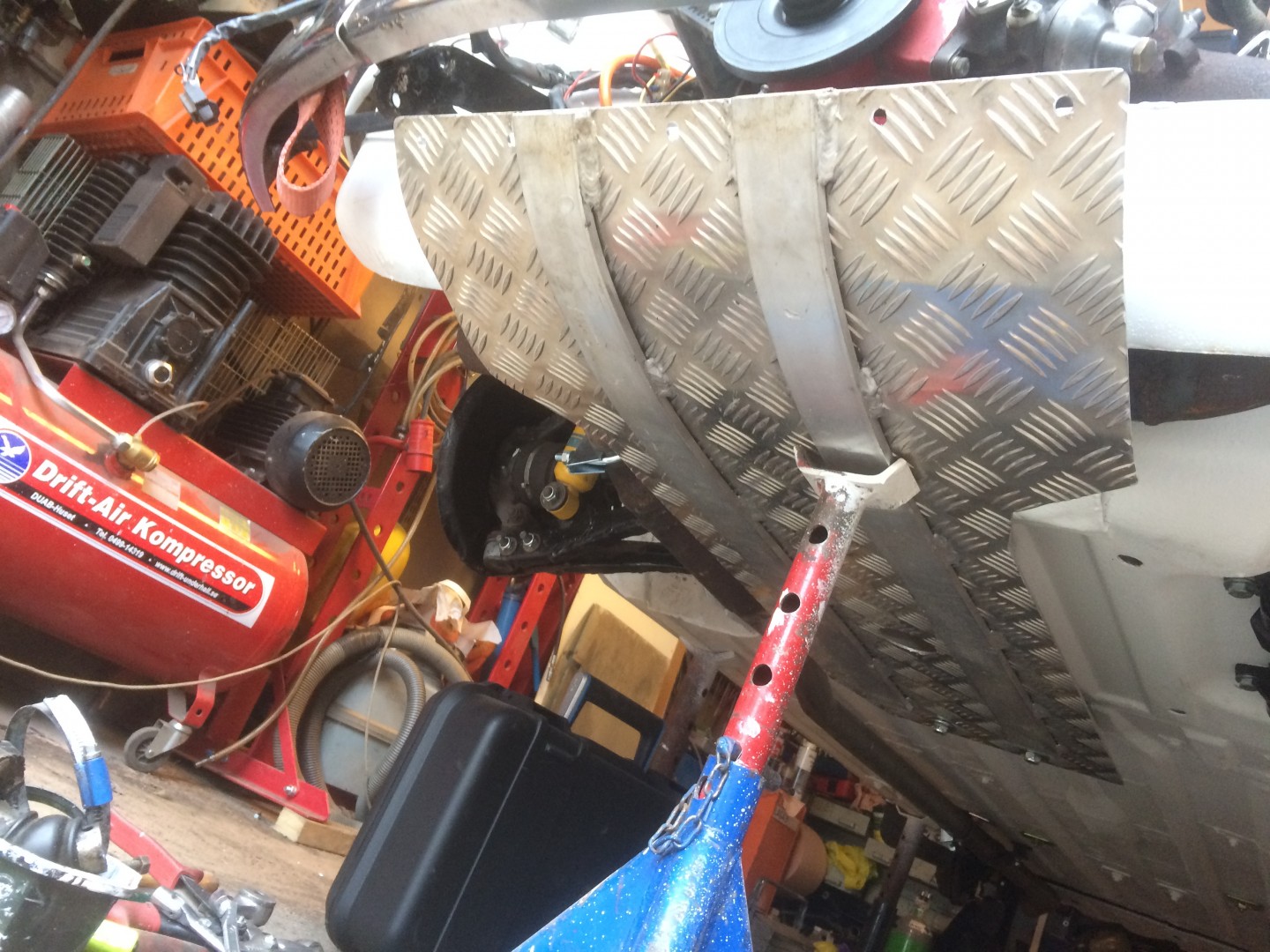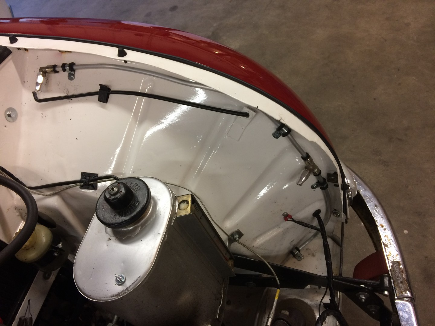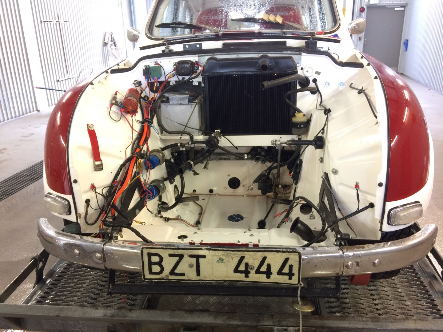 Lackerades i samma vita färg som karossen.Tillbringade en lördag i verkstaden på jobbet och monterade in ett sprinklersystem som krävdes