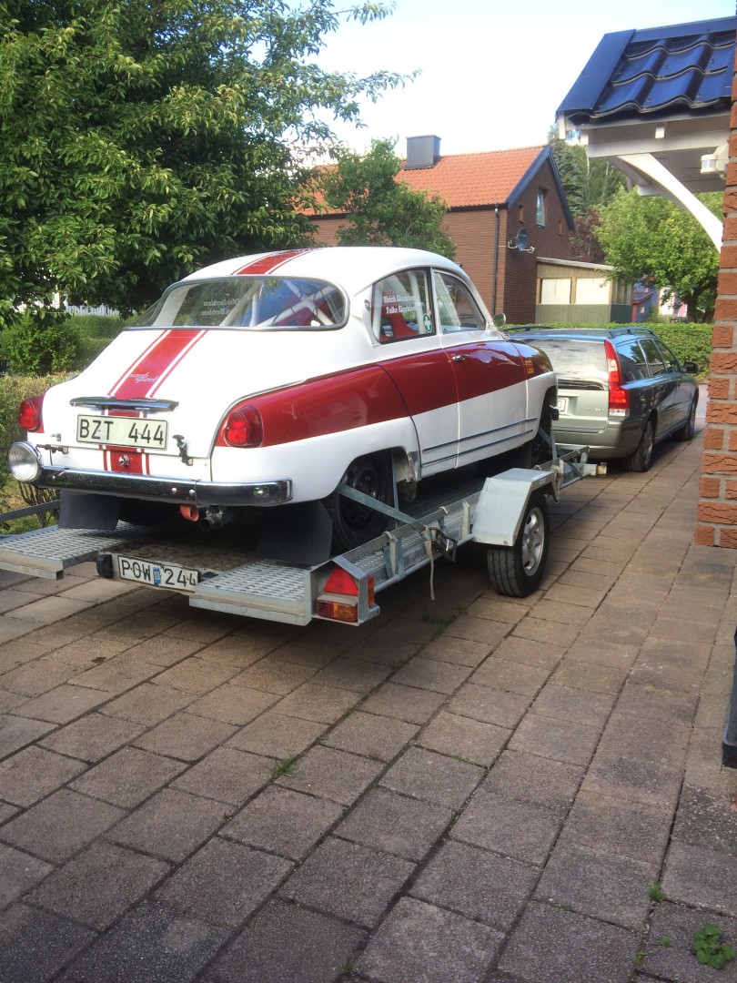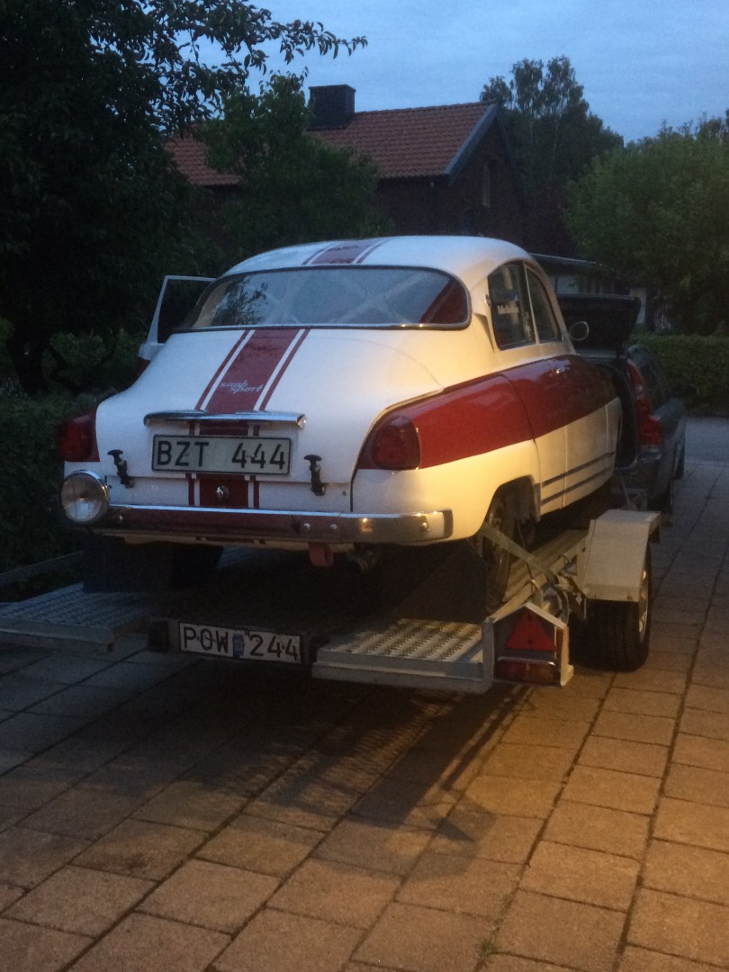 Som vanligt är man en tidsoptimist och då jag bokat tid för en HTP-besiktning till tisdag 18/7 nere i Skåne hos min vän som lackerat bilen blev det till att lasta den på släpet och dra iväg.Anländer till Skåne och gör en lite längre provtur på c:a tre mil med nyrenoverade motorn, fungerar rätt bra.