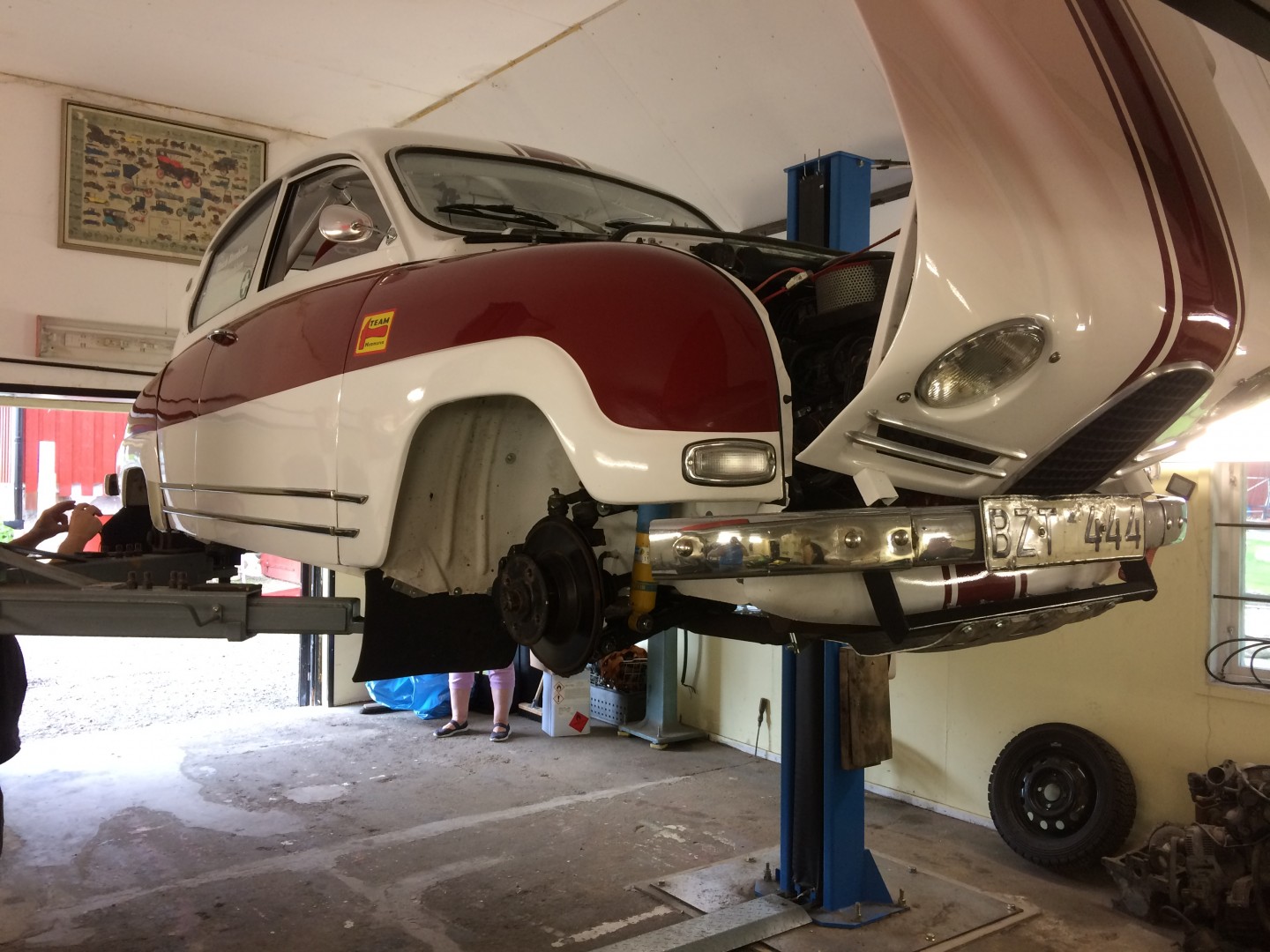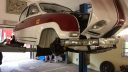 Bilen upplyft och hjulen demonterade enligt önskemål från teknikern.
