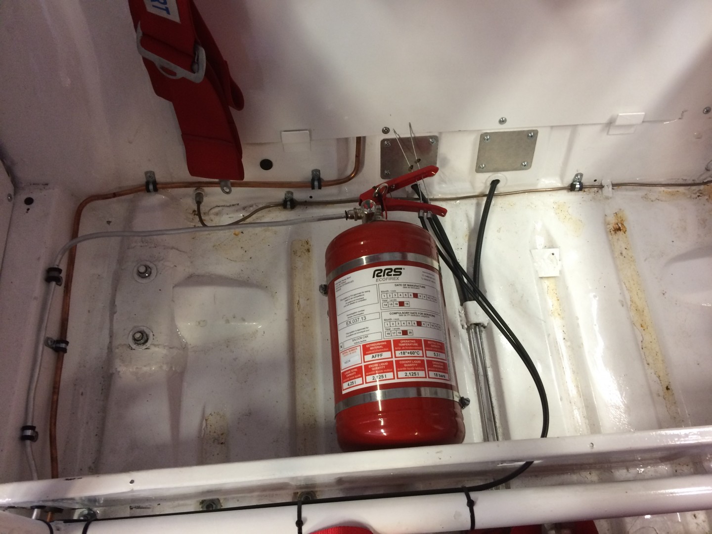 Behållaren med släckmedel fick placeras där en gång i tiden baksätet satt.