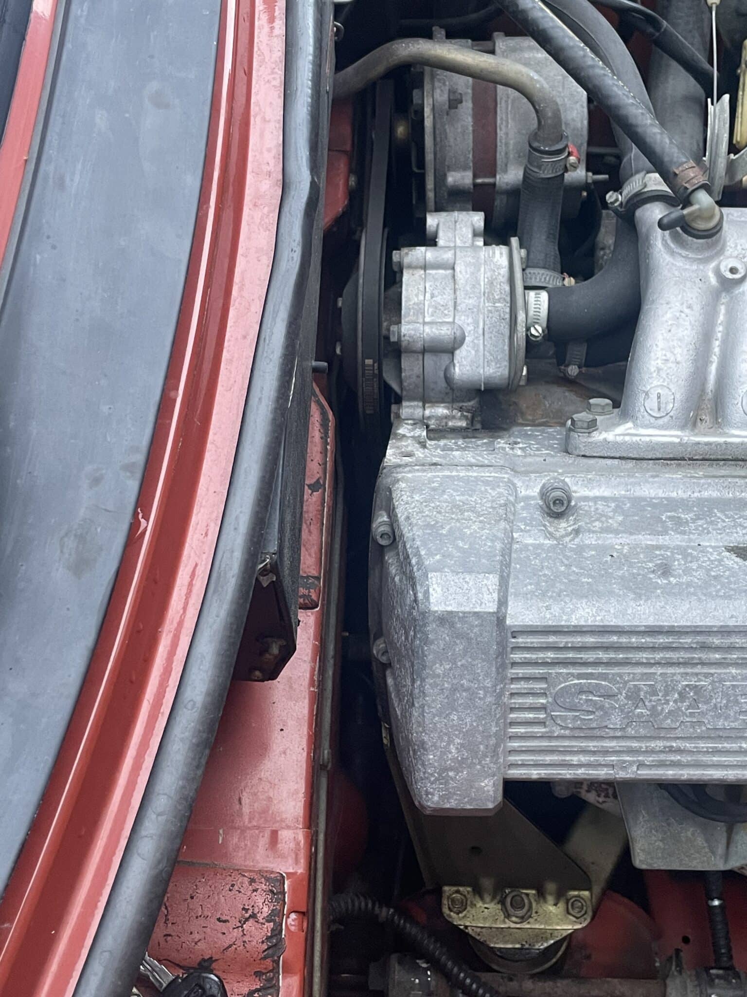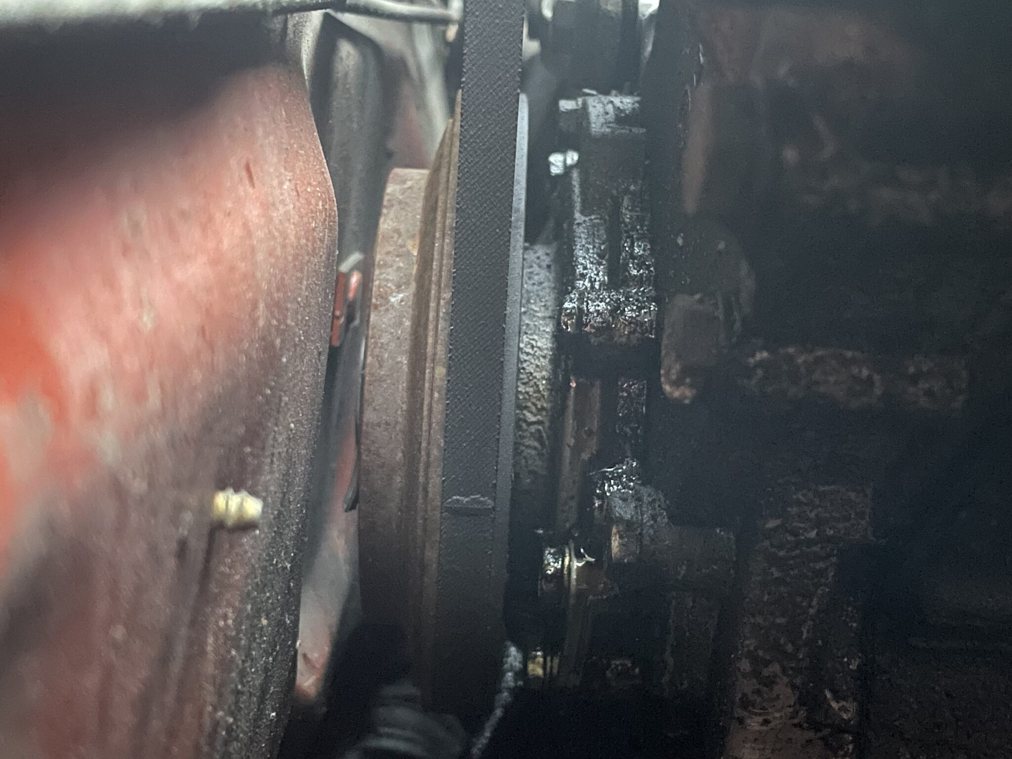 Såg att den läcker lite olja (svart/brun) när jag tittade under bilen. Ser också att det är ganska mycket klet vid kamkedjan. Torkade rent och ser att det sakta rinner lite olja.